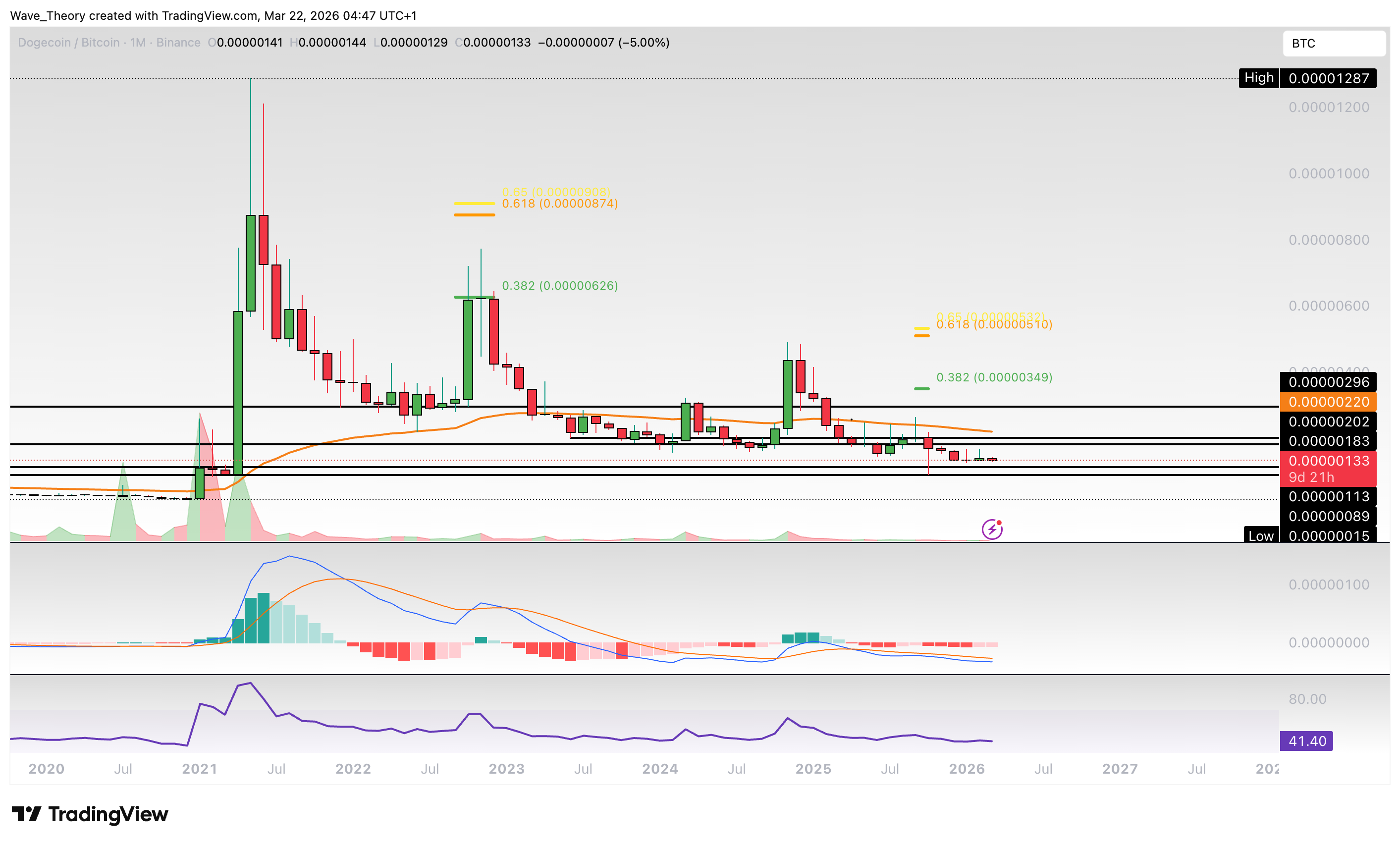 Weitere entscheidende Fibonacci Zonen liegen bei etwa 0,0000035 BTC sowie 0,0000052 BTC. Erst wenn diese Bereiche überwunden werden, wäre die laufende Korrektur technisch beendet.