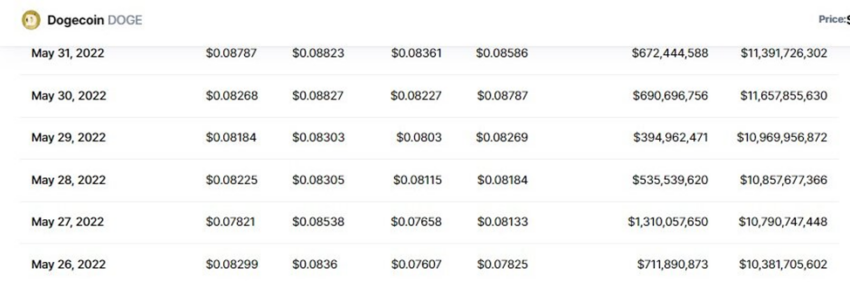 Der Dogecoin Kurs eröffnete den 1. Mai 2022 bei 0.1276 USD. Danach erreichte der Doge Kurs am 5. Mai 2022 das Monatshoch bei 0.1373 USD, fiel dann am 12. Mai 2022 auf das Monatstief und schloss dann den Monat mit 0.08586 USD ab.