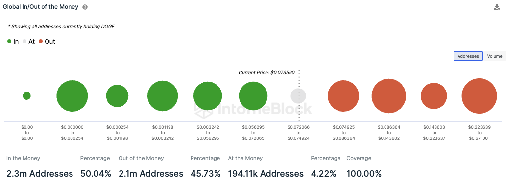 Fast exakt 50 % der Adressen, die DOGE halten, können zum aktuellen Kurs mit Gewinn verkaufen. Rund 46 % sind dabei im Minus und 4,22 % sind Break-even.