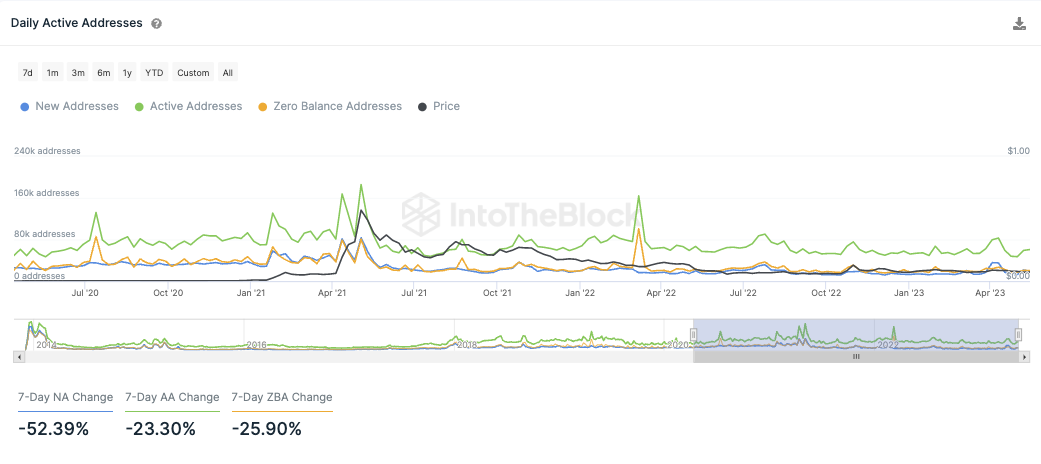 Die Anzahl der aktiven Adressen innerhalb eines Tages zeigt einen starken Rückgang