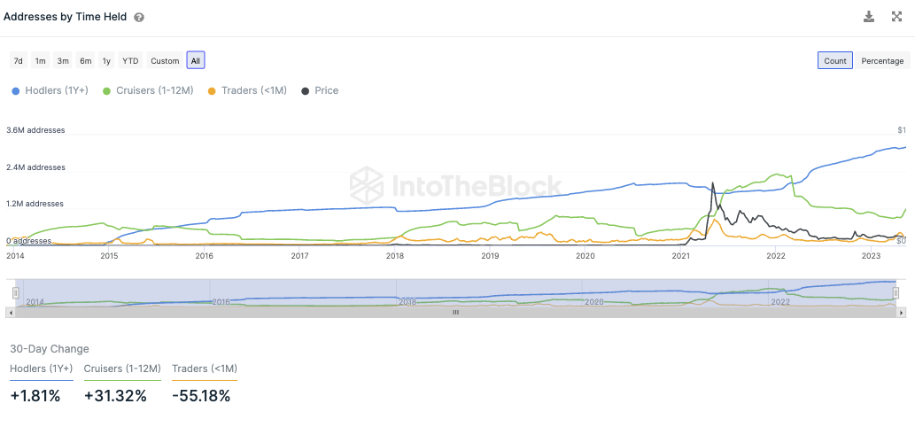 Die Zahl der Adressen, die DOGE länger als ein Jahr halten, nimmt stetig zu