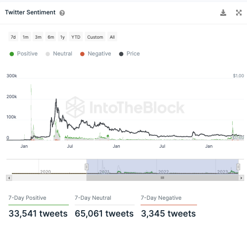 Die Stimmungen auf Twitter ist im 7-Tages Trend aber nach wie vor sehr positiv. Denn es gibt zehnmal mehr positive Tweets zu Dogecoin als negative.