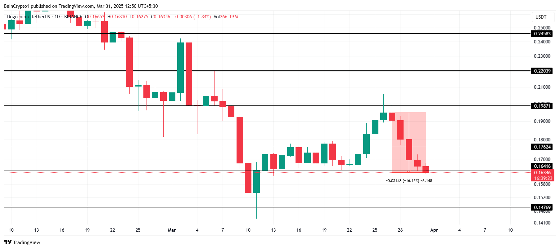 Dogecoin wird derzeit bei 0,163 USD gehandelt, mit dem Kurs knapp unter dem Unterstützungsniveau von 0,164 USD. In den letzten fünf Tagen hat der Coin einen Rückgang von 16 Prozent erlebt, nachdem ein Versuch, das Widerstandsniveau von 0,198 USD zu durchbrechen, gescheitert war. Dieses Scheitern, wichtige Widerstandsniveaus zu überwinden, deutet darauf hin, dass DOGE möglicherweise keine sofortigen Kursgewinne ohne externe Katalysatoren erleben wird.