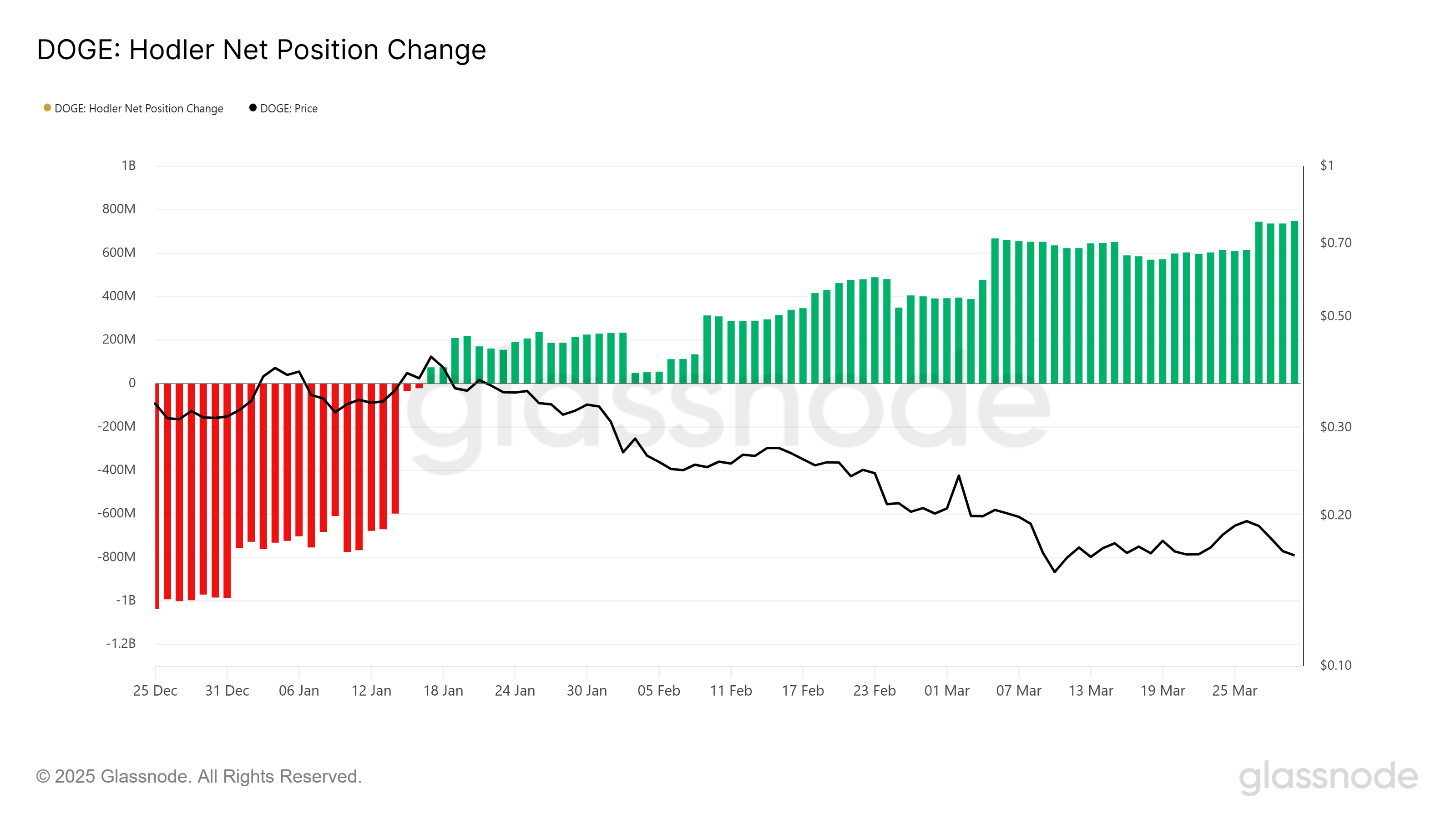Das makroökonomische Momentum von Dogecoin zeigt Anzeichen der Stabilisierung, wie der jüngste Anstieg der HODLer-Netto-Positionsänderung belegt. LTHs haben während des jüngsten Rückgangs aktiv DOGE angesammelt, was auf eine starke Überzeugung dieser Halter hinweist.