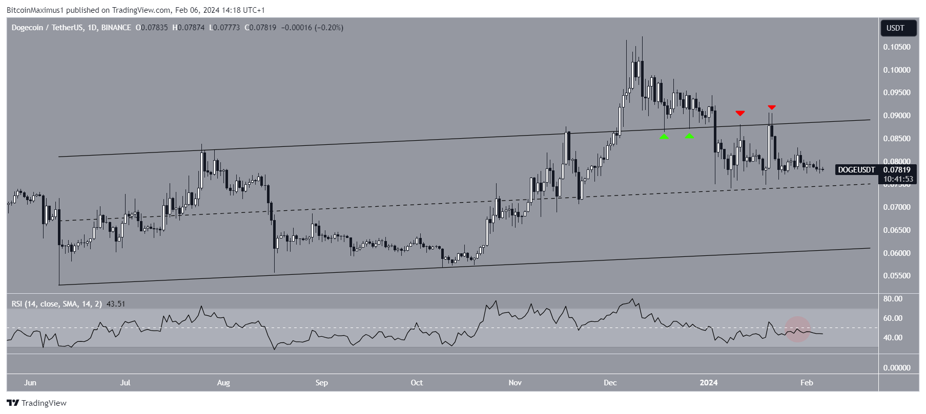 Eine technische Analyse des Tagescharts zeigt, dass DOGE seit Juni 2023 innerhalb eines aufsteigenden Kanals gehandelt wird, mit einem Höchststand von 0,107 US-Dollar im Dezember 2023.
