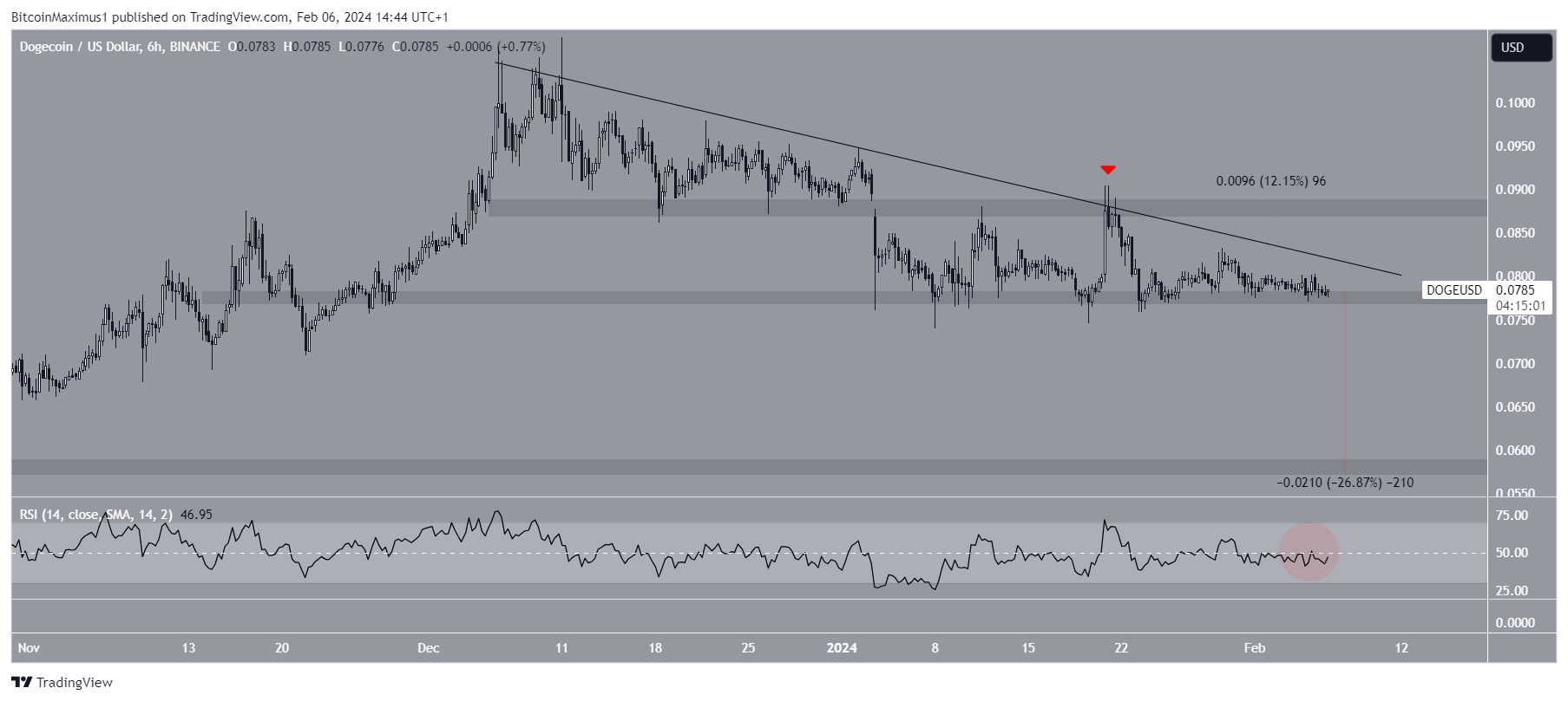 Die technische Analyse auf dem Sechs-Stunden-Chart deutet aufgrund der Preisentwicklung von Dogecoin seit Dezember 2023 auf einen bärischen Ausblick hin. Die Bewegung ähnelt einem absteigenden Dreieck, was als bärishes Muster angesehen wird.