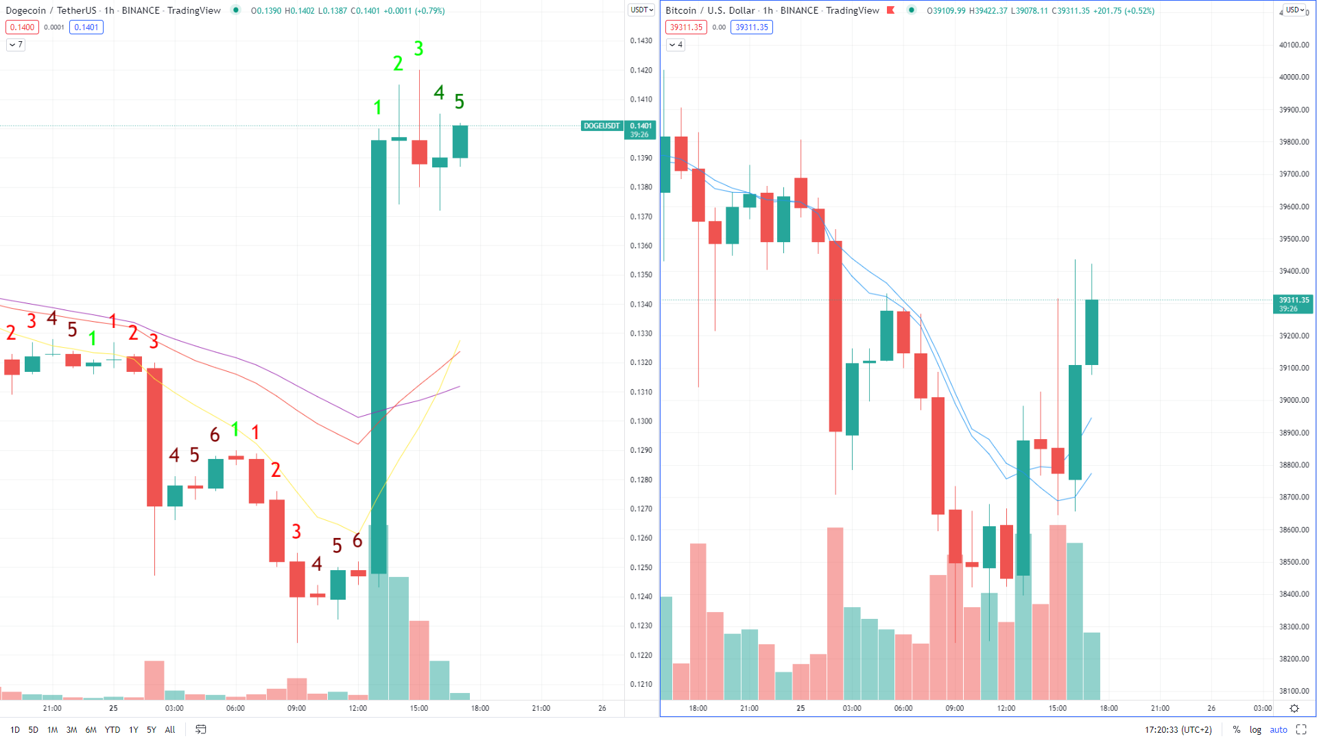 Der Dogecoin Kurs stieg zeitgleich mit dem Bitcoin Kurs an, konnte jedoch – wohl auch aufgrund der News vergleichsweise deutlich an Fahrt gewinnen und den bereits deutlich über den Eröffnungskurs bzw. das letzte Hoch ansteigen (+10% in einer Stunde!). Auch die Ankündigung über das DeFi-Upgrade könnten den Kursanstieg begünstigt haben.