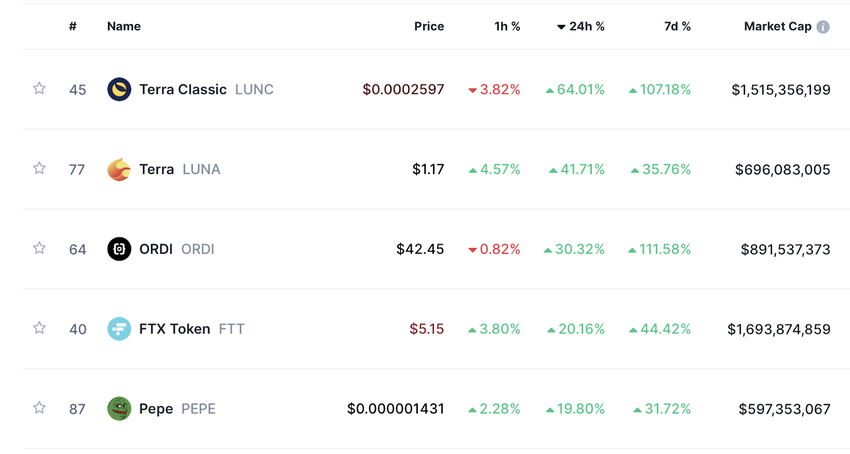Ein Blick auf die Top 100 der größten Kryptowährungen nach Marktkapitalisierung bringt wahrscheinlich den meisten Investoren Grund zur Freude. Sortiert man die Coins nach Gewinnen der letzten 24 Stunden, zeigt sich bei vielen ein Plus im zweistelligen Prozentbereich. Terra Classic (LUNC) hat mit einem Plus von 64 % die Nase deutlich vorn, gefolgt von LUNA mit einem Gewinn von über 40 %. Unter den fünf größten Gewinnern befindet sich auch PEPE mit einem Plus von knapp 20 %.
