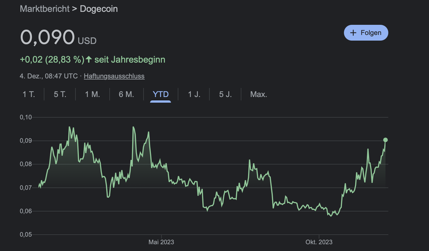 (DOGE Kursentwicklung seit 1.1.2023 – Quelle: google.de)