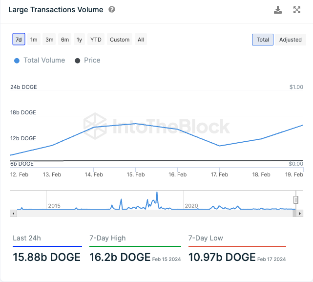 In den letzten 24 Stunden hat IntoTheBlock einen signifikanten Anstieg an Großtransaktionen von über 100.000 USD verzeichnet. Dies deutet auf eine hohe Wal-Aktivität im DOGE Ökosystem hin.