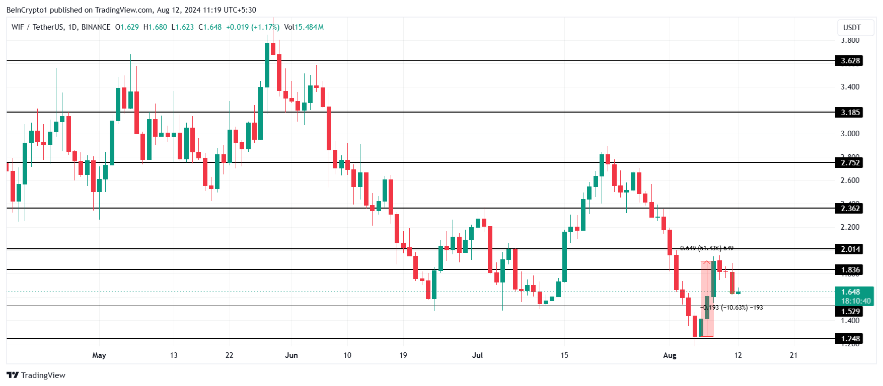 Sollte es der WIF jedoch nicht gelingen, die Unterstützung bei 1,83 USD zu halten, ist ein erneuter Rückgang auf 1,52 USD wahrscheinlich. Dieses Mal könnte Memecoin deutlich höhere Abflüsse verzeichnen, was eine Erholung erschweren könnte.