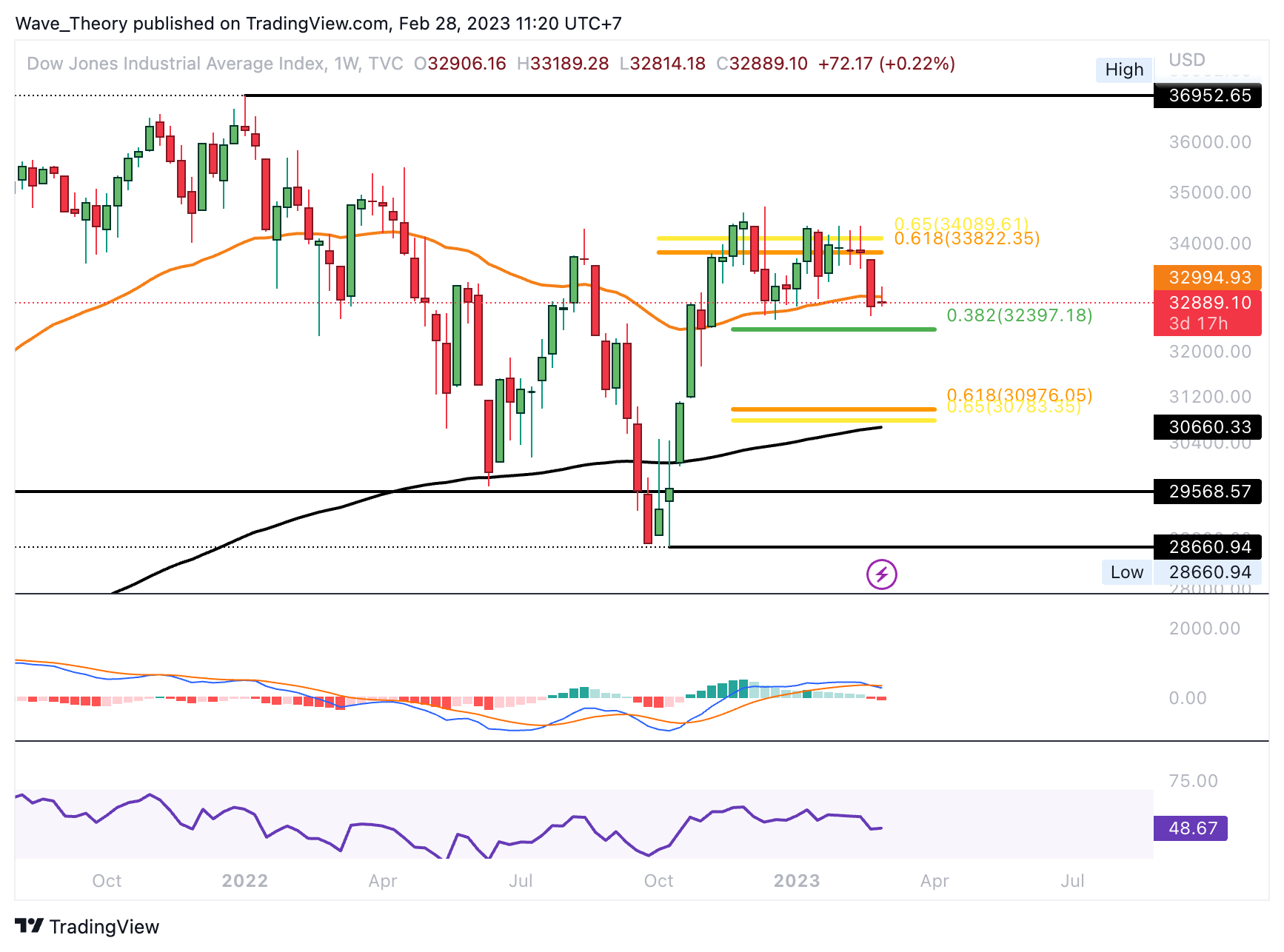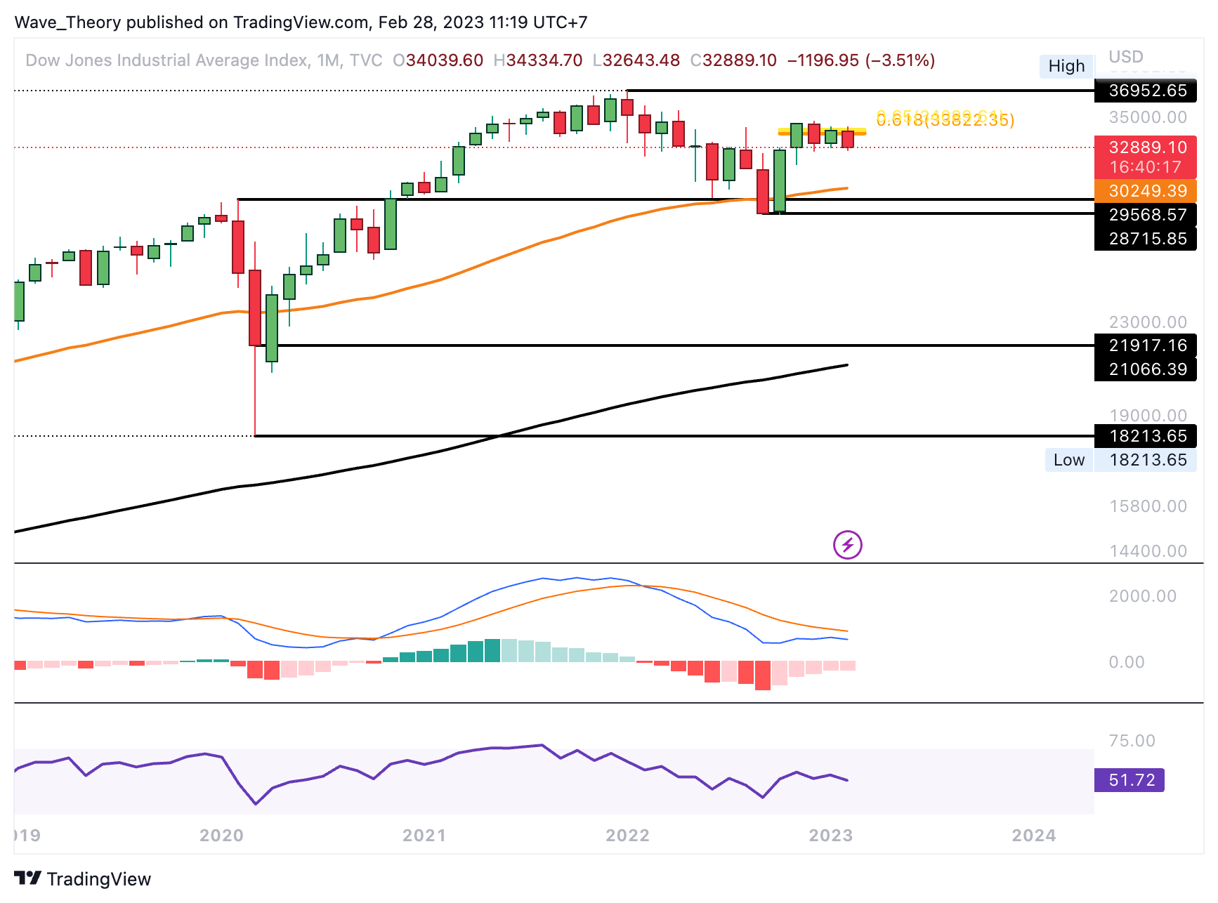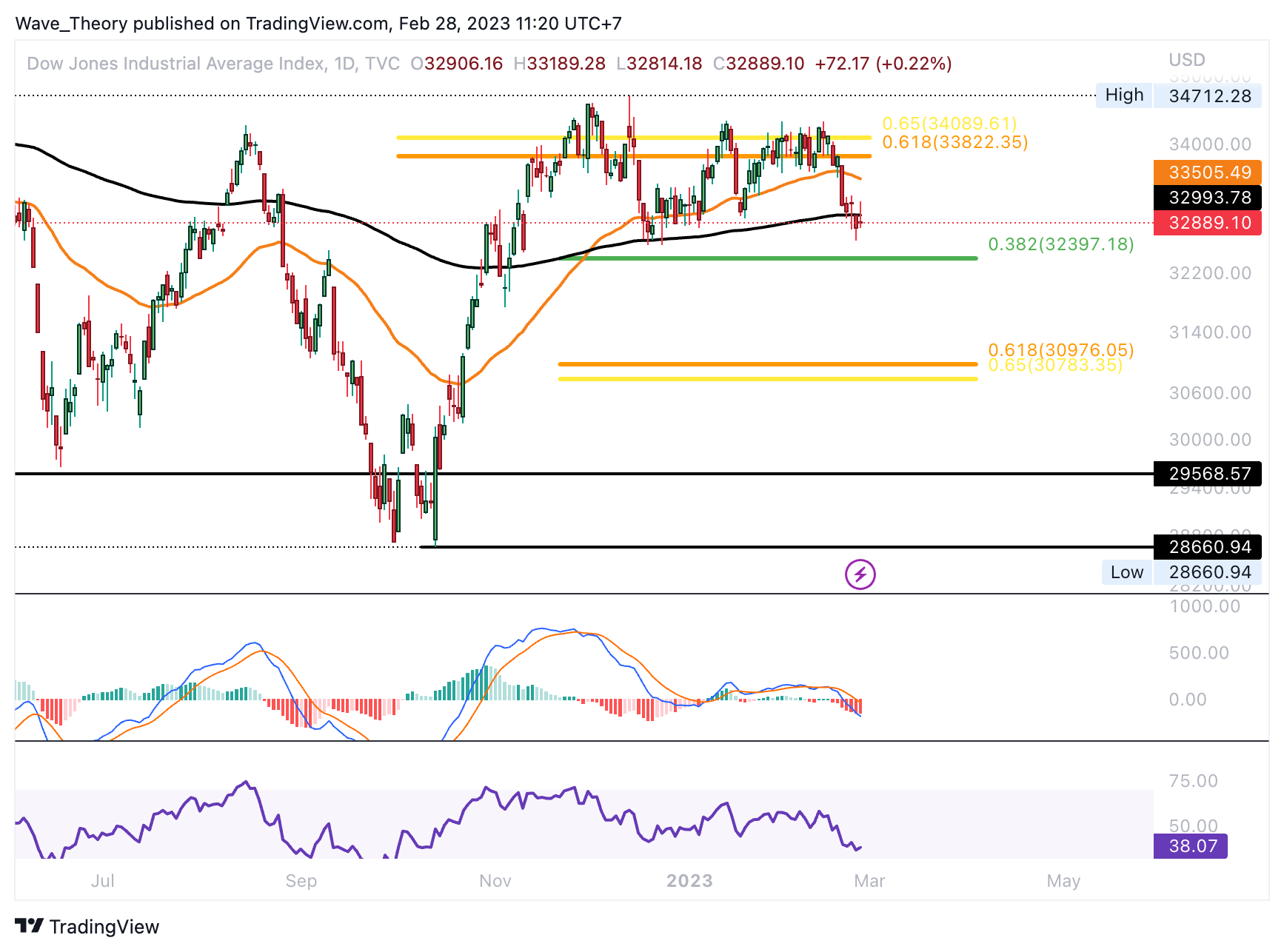 Der Dow Jones Index stößt am Golden Ratio Widerstand bei rund 34.000 auf Ablehnung