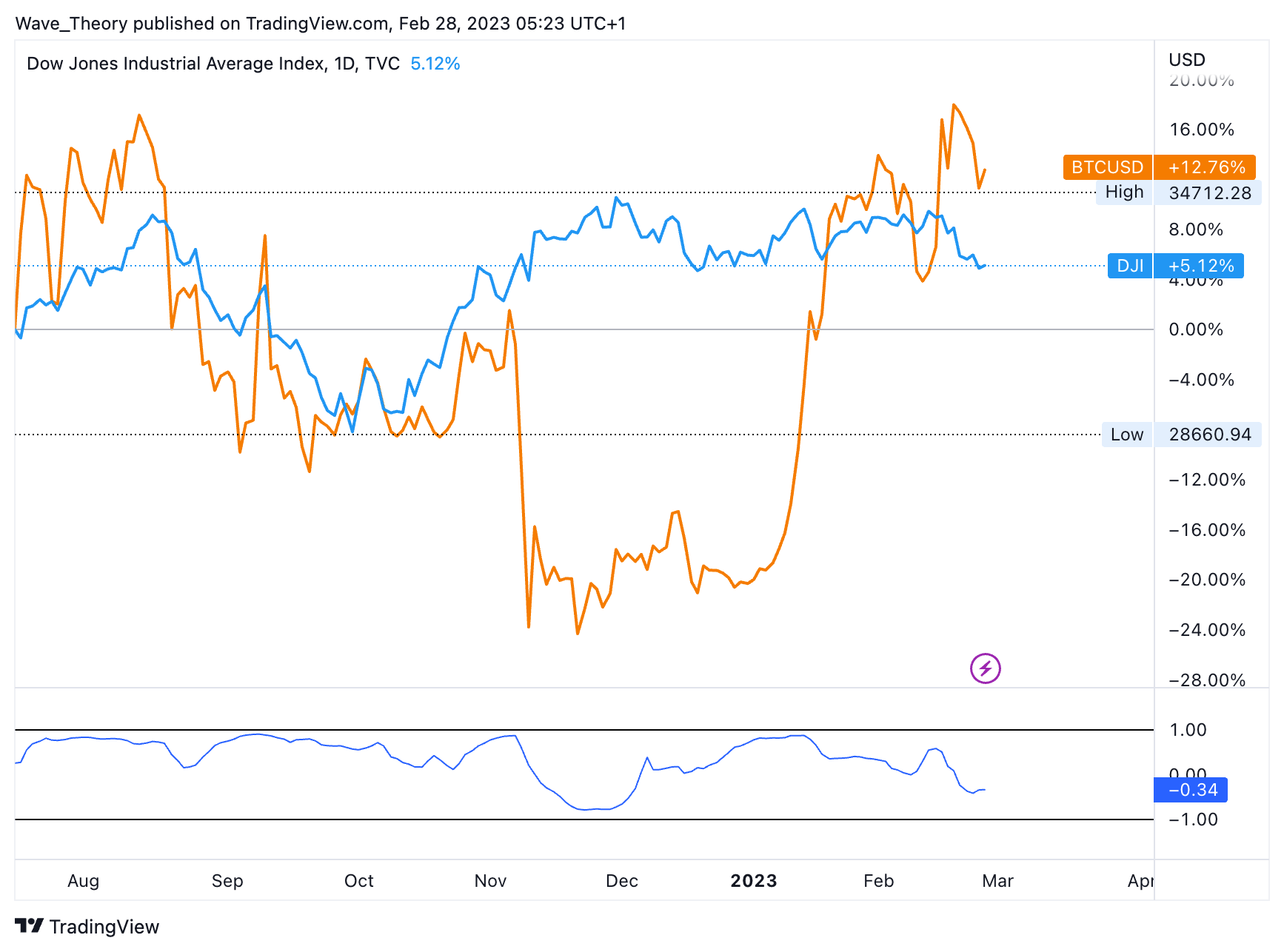 Eine Korrelation zwischen dem Bitcoin Kurs und dem Dow Jones Index liegt derzeit nicht vor. Seit dem Beginn des neuen Jahres ist der Bitcoin Kurs ordentlich nach oben geschossen, während sich der DJI eher seitwärts mit einer leichten Abwärtsneigung bewegt.