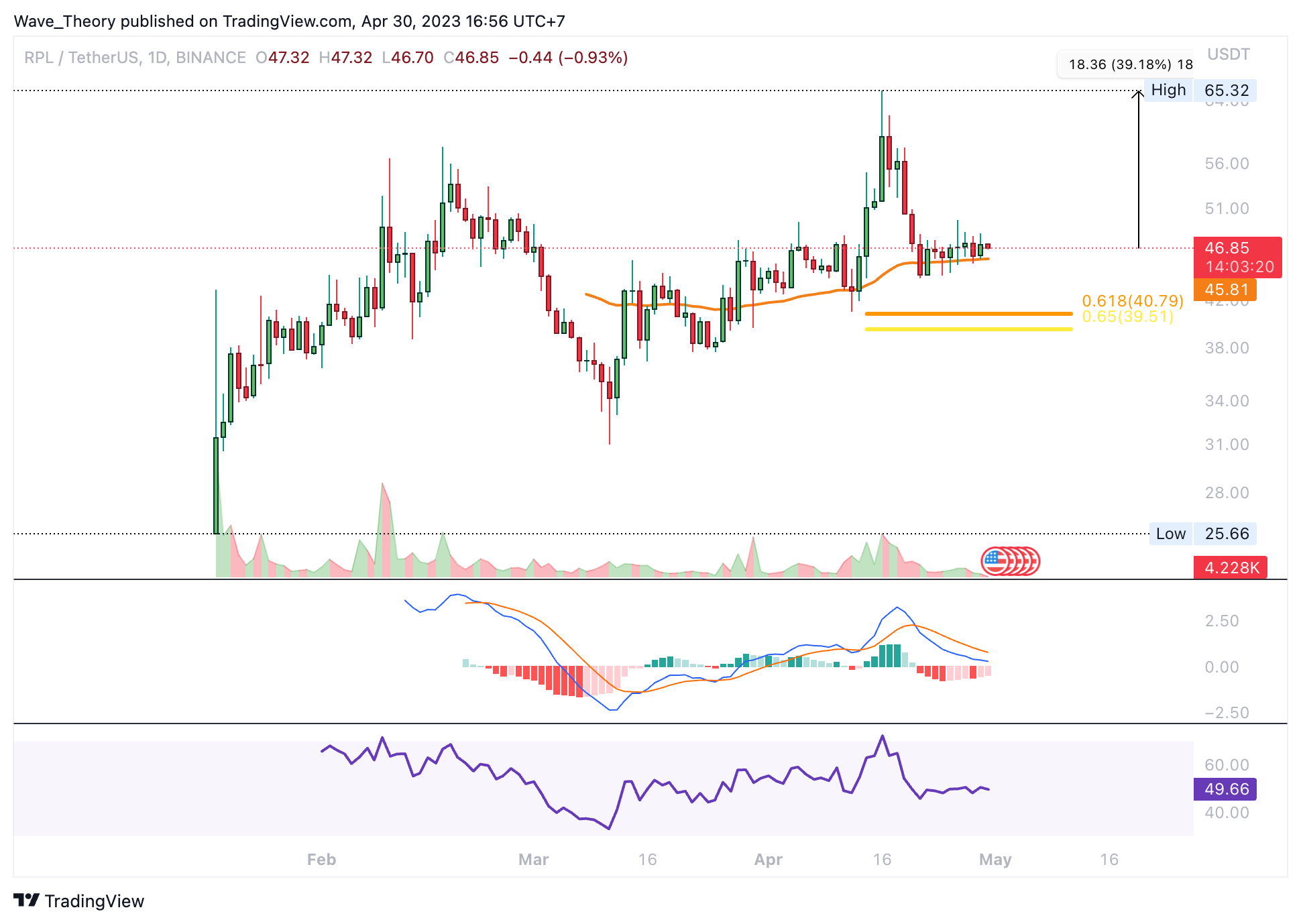 Der Rocket Pool Kurs ist nur rund 39 % vom Allzeithoch bei rund 65,3 USD entfernt. Darüber hinaus scheint RPL aktuell am 50-Tage-EMA Unterstützung zu finden. Dort könnte RPL bullisch abprallen, um das ATH bei rund 65,3 USD anzuvisieren. Ansonsten wartet spätestens bei rund 40 USD signifikante Fib Unterstützung auf den RPL Kurs.
