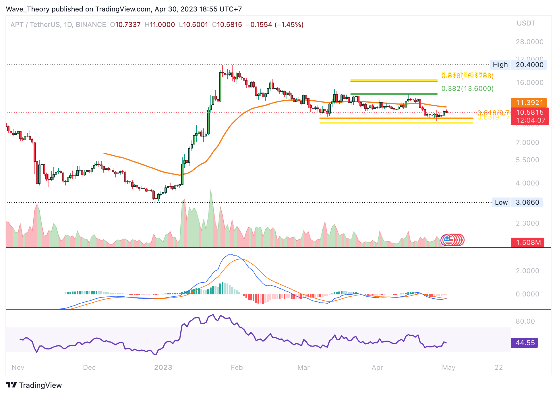 Seither befindet sich Aptos in einer Korrekturbewegung. Der APT Kurs stößt jetzt auf die entscheidenden Fibonacci Unterstützung. Denn wenn APT jetzt an der Golden Ratio bei rund 9,5 USD bullisch abprallt, könnte Aptos versuchen, die nächsten Fib Widerstände bei rund 13,6 USD respektive 16,5 USD zu brechen.
