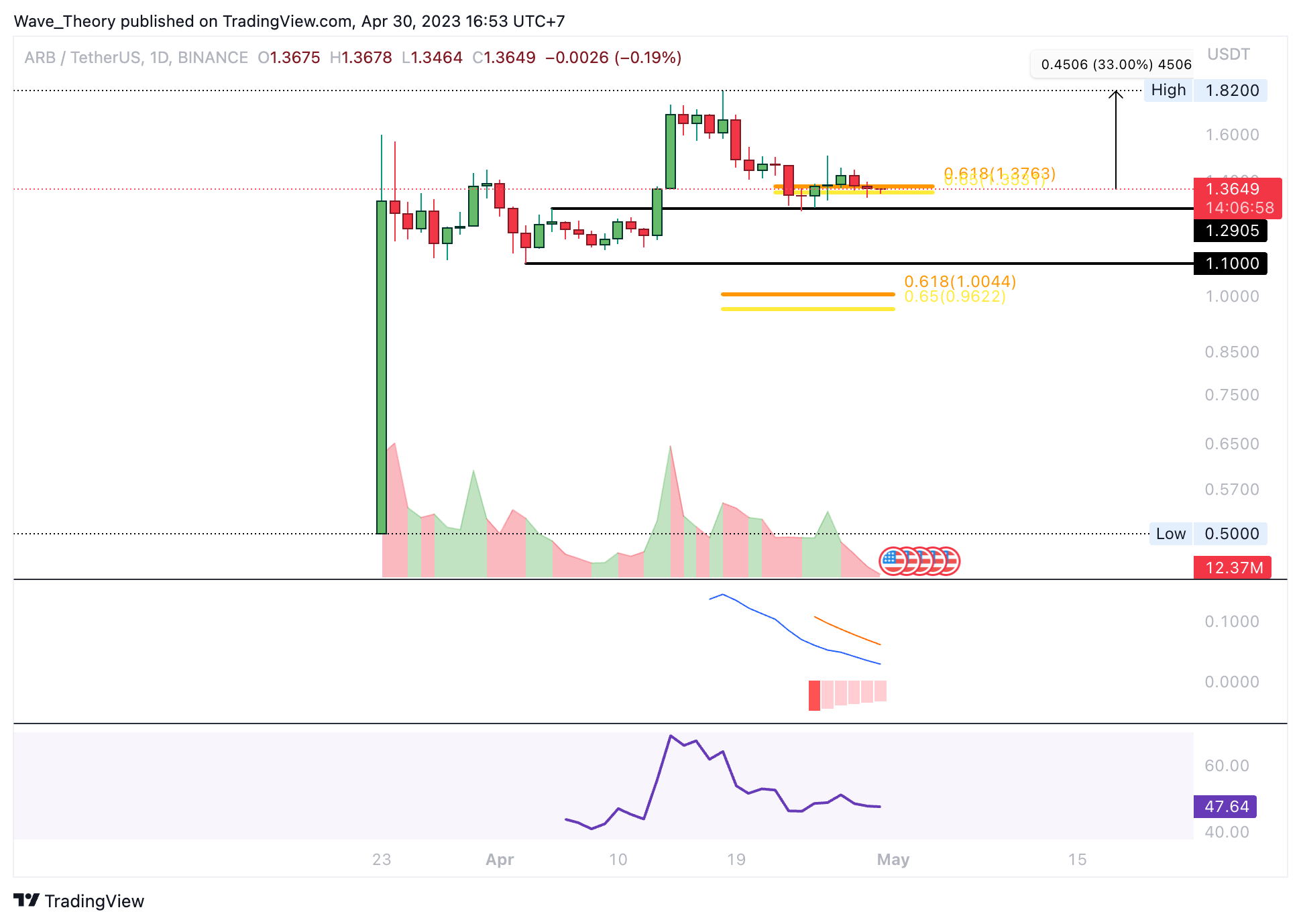 Arbitrum ist der dritte Coin, der im Mai ein neues Allzeithoch erreichen könnte. Derzeit liegt die Marktkapitalisierung von Arbitrum bei rund 1,74 Milliarden USD.