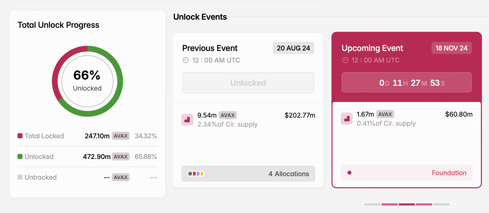 In der kommenden Woche wird Avalanche die Token-Freigabe-Landschaft dominieren, mit einem großen Release am 18. November. Das Projekt plant, 1,67 Millionen AVAX-Token im Wert von über 60 Millionen USD freizugeben. Diese Token werden der Avalanche Foundation zugeteilt, um das weitere Wachstum und die Entwicklungsinitiativen des Krypto-Projekts zu unterstützen.
