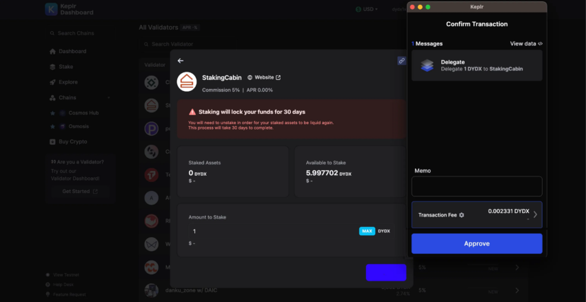 - Wähle einen Validator aus der Liste und entscheide, wie viel DYDX du einsetzen möchtest.