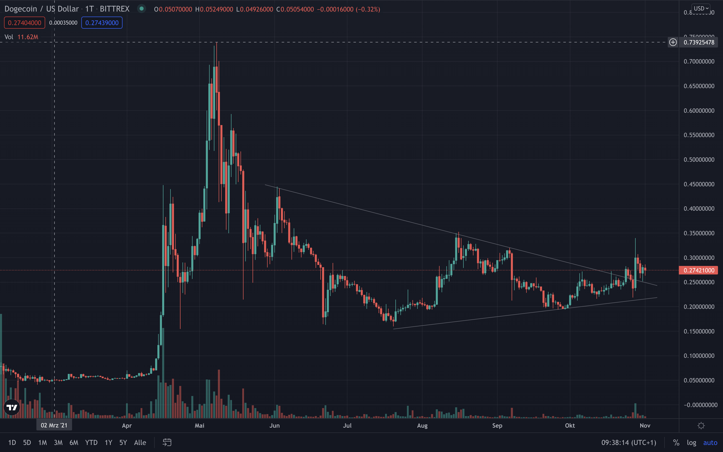 Bis zum jüngsten Ausbruch des Dogecoin Kurses am 28. Oktober war unklar, ob der DOGE Kurs allgemein fallen oder steigen wird. Dieser Durchbruch wird allerdings als bullisches Zeichen für einen weiteren Preisanstieg angesehen. Der Dogecoin Kurs stabilisierte sich zwischen Juni und Juli 2021 im Bereich von ungefähr 0.155 USD und kletterte dann im September 2021 auf 0.196 USD.