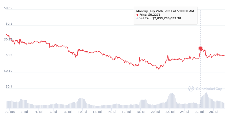 Elon Musk twitterte nicht zum ersten Mal über Dogecoin. Für seine (versuchte) Einflussnahme auf verschiedene Krypto-Preise erntete der SpaceX-CEO teilweise heftige Kritik. Nun widmet sich Musk erneut DOGE und erklärte auf Twitter, dass Dogecoin kein spekulativer Vermögenswert sei, sondern eben echtes Geld. Wie schon so oft, beeinflusste der Musk´sche Tweet auch diesmal den Dogecoin Preis und trieb den DOGE Kurs um 0,20 US-Dollar nach oben. Zeitweise lag der DOGE Preis deswegen bei 0,2273 US-Dollar.