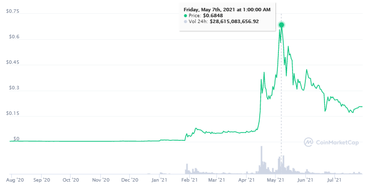Der Preisanstieg war allerdings nicht von langer Dauer und der Dogecoin Kurs fiel schnell auf sein vorheriges Niveau zurück. Während der letzten Rallye gab es heftige Diskussionen um den gehypten Meme-Coin, der von verschiedensten Prominenten auf sozialen Netzwerken gepusht wurde. Dadurch erreichte der Dogecoin Preis ein Hoch bei 0,6848 US-Dollar.
