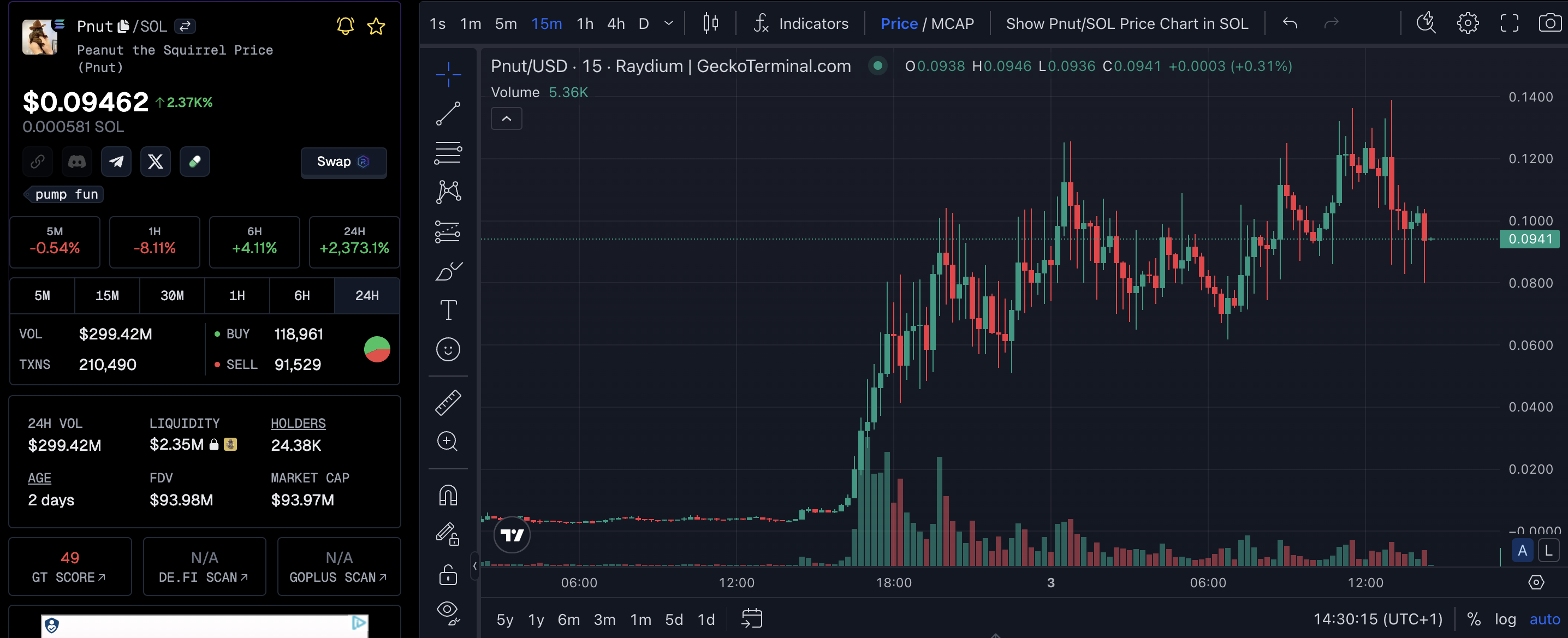 Laut Gecko Terminal ist die Marktkapitalisierung von PNUT jedoch auf 93,98 Millionen USD gesunken. Der Kurs fiel auf 0,094 USD, da frühe Memecoin-Käufer Gewinne mitnahmen.