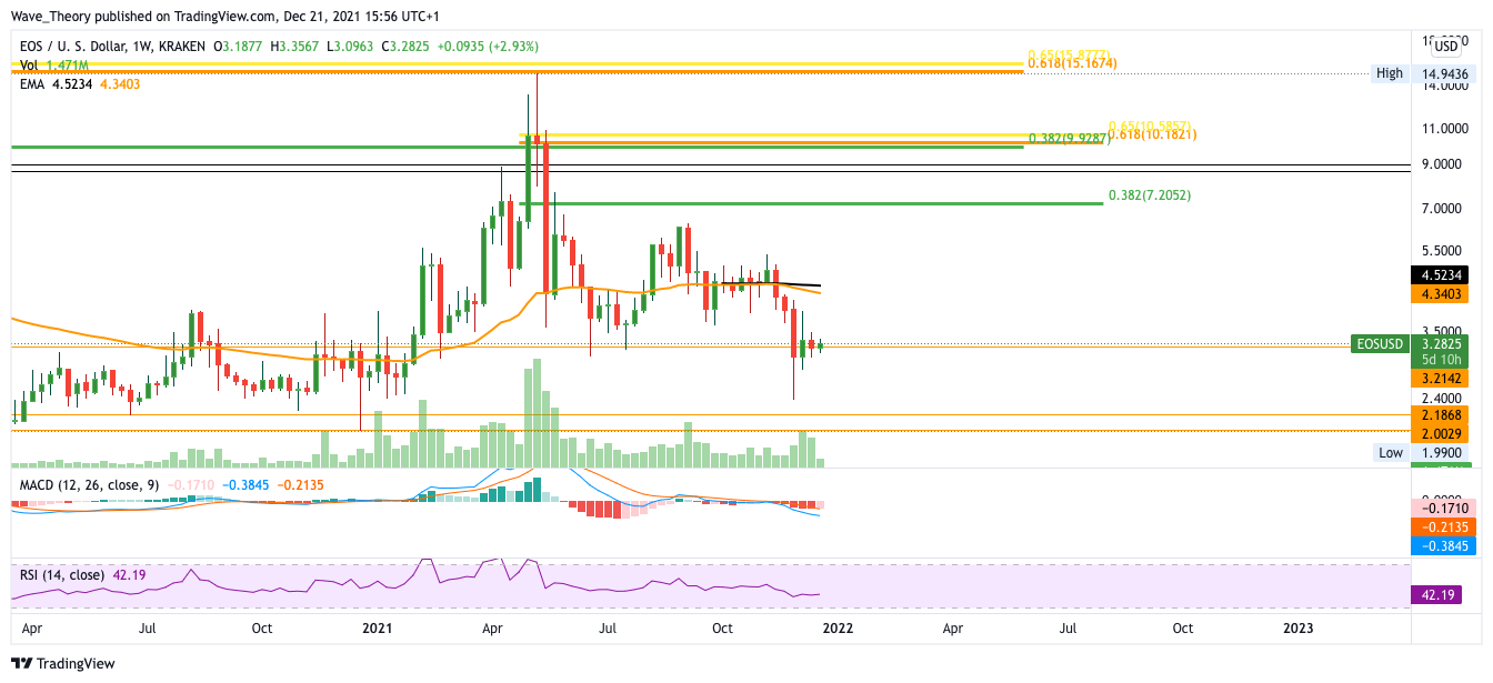 Tatsächlich gewinnt der 200-Wochen-EMA gerade Überhand gegenüber dem 50-Wochen-EMA und formt damit ein Death Cross. Sollte EOS durch die aktuelle Unterstützung bei rund 3 USD durchbrechen, findet EOS erst wieder bei rund 2 USD Unterstützung. Trotz dieser bärischen Aussichten, tickt das Histogramm des MACDs diese Woche bullisch höher. Jedoch könnte sich dies im Lauf der Woche noch ändern, da die Woche erst begonnen hat. Sollte das Histogramm diese Woche aber bullisch schließen, wäre dies ein bullisches Zeichen und ein Hinweis auf eine kurzfristige Aufwärtsbewegung. EOS findet dann bereits bei rund 7 USD den nächsten signifikanten Widerstand.