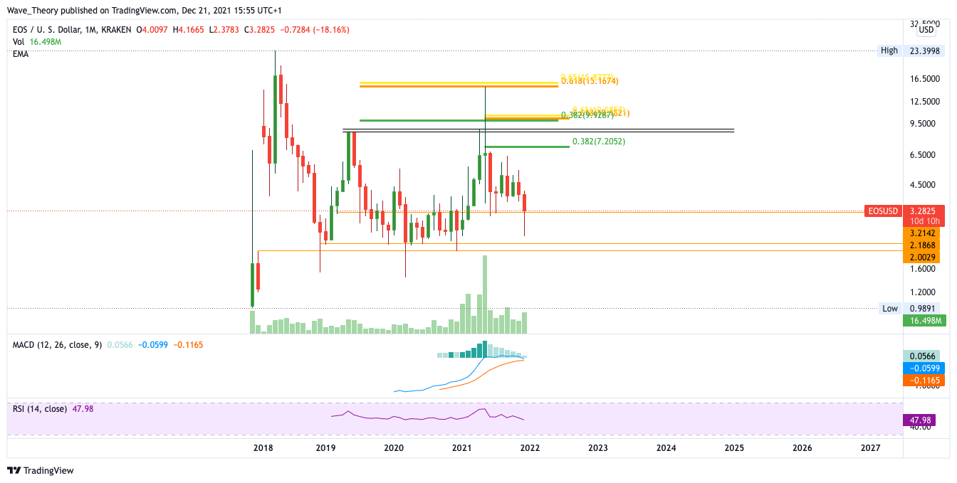 Am Höhepunkt des diesjährigen Bullenzyklus erreichte EOS rund 15 USD, wobei er an der Golden Ratio bärisch abgewiesen wurde. Daraufhin kehrte der EOS Kurs zur Unterstützung bei rund 3 USD zurück, woraufhin EOS den Versuch unternahm, die Korrektur zu beenden und bullisch auszubrechen. Dabei bleibt aber selbst der horizontale Widerstand bei rund 9 USD unberührt und EOS zeigt sich insbesondere in diesem Monat sehr bärisch.