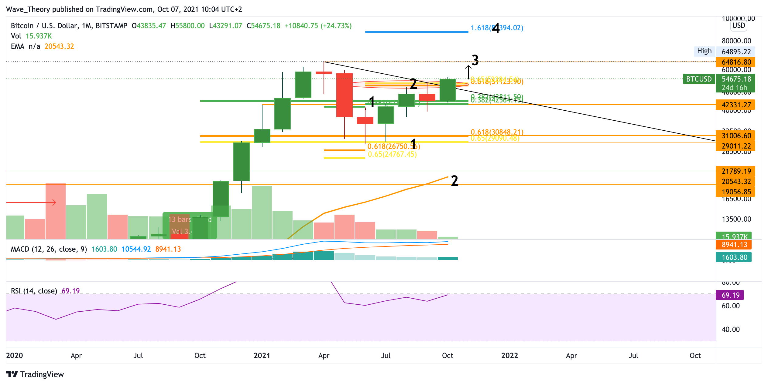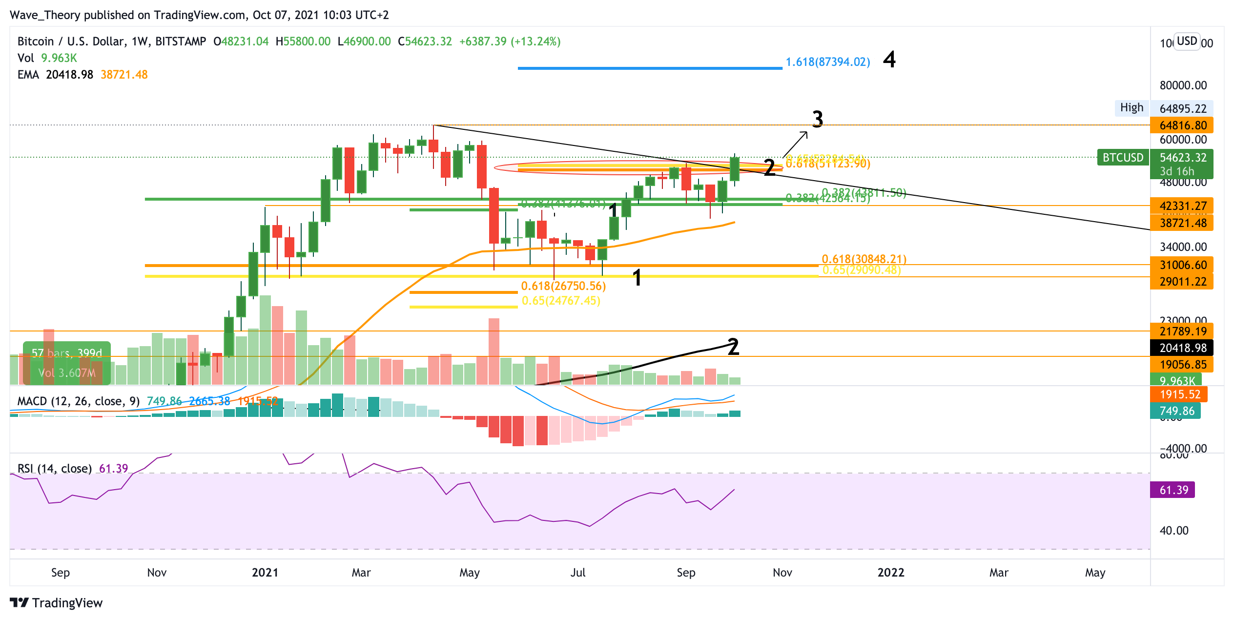 Damit liegt das nächste Kursziel für den Bitcoin Kurs bei rund 65.000 USD, wo Bitcoin sein Allzeithoch etablierte. Wird dieses ebenfalls gebrochen, so findet Bitcoin erst bei rund 87.000 USD signifikanten Widerstand. Sollte Bitcoin also noch dieses Jahr das Allzeithoch übertreffen, rücken die 100.000 USD in greifbare Nähe, da sich lediglich kurz davor bei 87.000 USD ein wichtiger Fibonacci Widerstand befindet. Der wöchentliche MACD zeigt sich ebenfalls bullisch und auch hier gibt der RSI keine bärischen Signale. Bitcoins Trend ist aktuell bullisch!