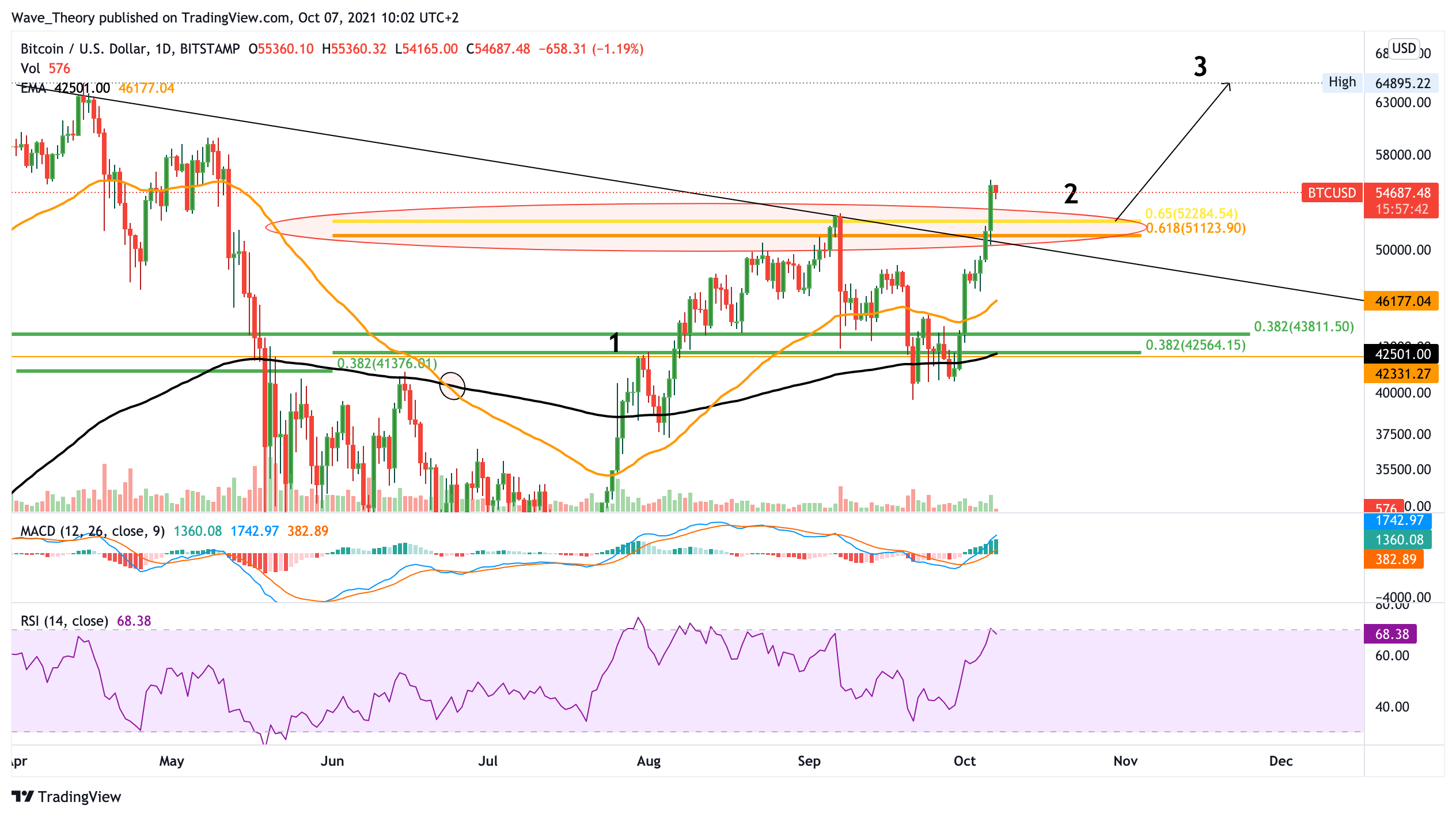 Zuvor scheiterte Bitcoin an dem Versuch, den entscheidenden Widerstand der Golden Ratio bei 52.000 USD zu durchbrechen. Daraufhin korrigierte der Bitcoin Kurs zum 0,382 Fib Niveau bei rund 42.000 USD und prallte dabei am 200-Tage-EMA stark ab. Seither befindet sich Bitcoin in einem Aufwärtstrend, welcher nicht zuletzt die wichtige Golden Ratio bei 52.000 USD durchbrechen konnte. Damit befindet sich Bitcoin aktuell wieder im Bullentrend! Auch der MACD signalisiert eine Fortsetzung des Aufwärtstrends und auch der RSI gibt keine bärischen Signale.