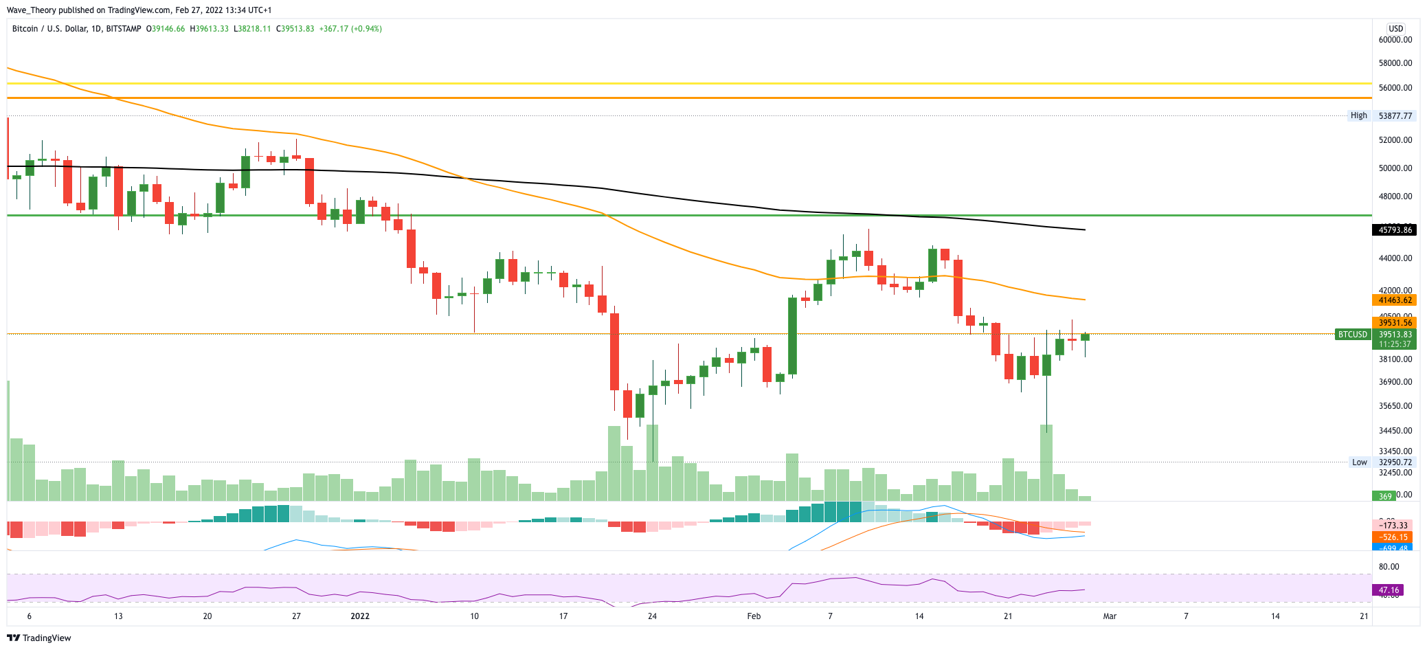 Die entscheidende Frage, die sich stellt, ist, ob Bitcoin noch im ersten Quartals des Jahres seinen Abwärtstrend beenden kann, um einen bullischen Trendwechsel zu initiieren. Letztendlich zeigt sich der MACD im Monatskurs noch eindeutig bärisch: sowohl die MACD Linien sind bärisch überkreuzt als auch das Histogramm bärisch tiefer tickt. Auch das Handelsvolumen hat stark abgenommen, seit Beginn des Jahres 2021. Dennoch steht der Monatskerzenschluss nur noch wenige Stunden entfernt und der Februar könnte der erste Versuch Bitcoins sein, die Korrektur in diesem Jahre zu beenden. Zwar erreichte Bitcoin noch immer nicht das Kursziel bei rund 30.000 USD, jedoch unternahm Bitcoin in diesem Monat bereits den Versuch, die erste Hürde des Bärentrends zu überwinden. Sollte Bitcoin es also in diesem Monat nicht schaffen, das 0,382 Fib Niveau bei rund 47.000 USD zu brechen, so könnte Bitcoin es im nächsten Monat erneut versuchen. Ansonsten findet Bitcoin nach wie vor zwischen 25.000 – 31.000 USD massive Unterstützung.