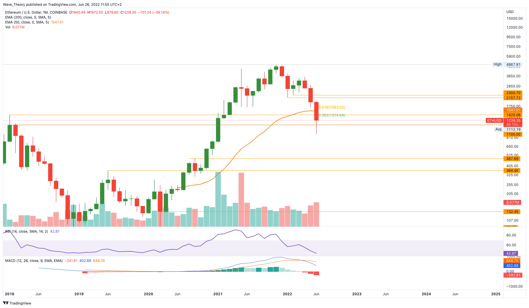 Sollte Ethereum den Fib Widerstand bei rund 1.300 USD brechen, wartet bei 1.420 USD noch der 50-Monate-EMA auf den ETH Kurs, welcher ebenfalls als Widerstand fungiert, bevor ETH auf rund 1.600 USD steigen könnte.