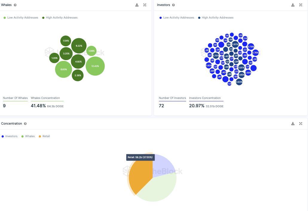 Zusätzlich halten neun Wal-Adressen rund 41,5 % aller Dogecoins, wobei jede dieser Adressen über mehr als 1 % der verfügbaren Tokens verfügt. Sechs dieser Adressen weisen dabei eine hohe Netzwerkaktivität auf.