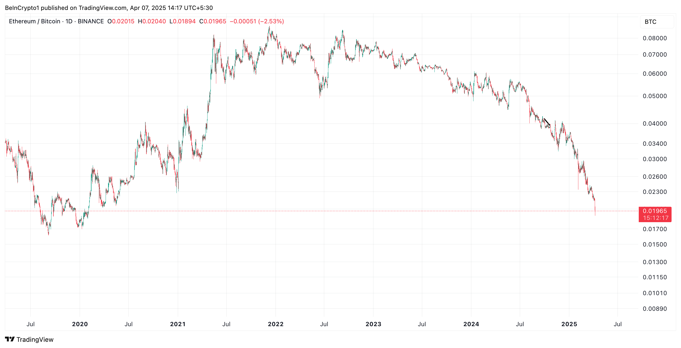 Der Rückgang des ETH-Kurses hat das Verhältnis von Ethereum zu Bitcoin (ETH/BTC) auf ein Fünfjahrestief von 0,019 gedrückt. Dieses Verhältnis misst den relativen Wert von ETH im Vergleich zu BTC. Wenn es steigt, zeigt es, dass ETH BTC übertrifft, entweder weil der Altcoin-Kurs schneller wächst oder der Bitcoin-Kurs fällt.