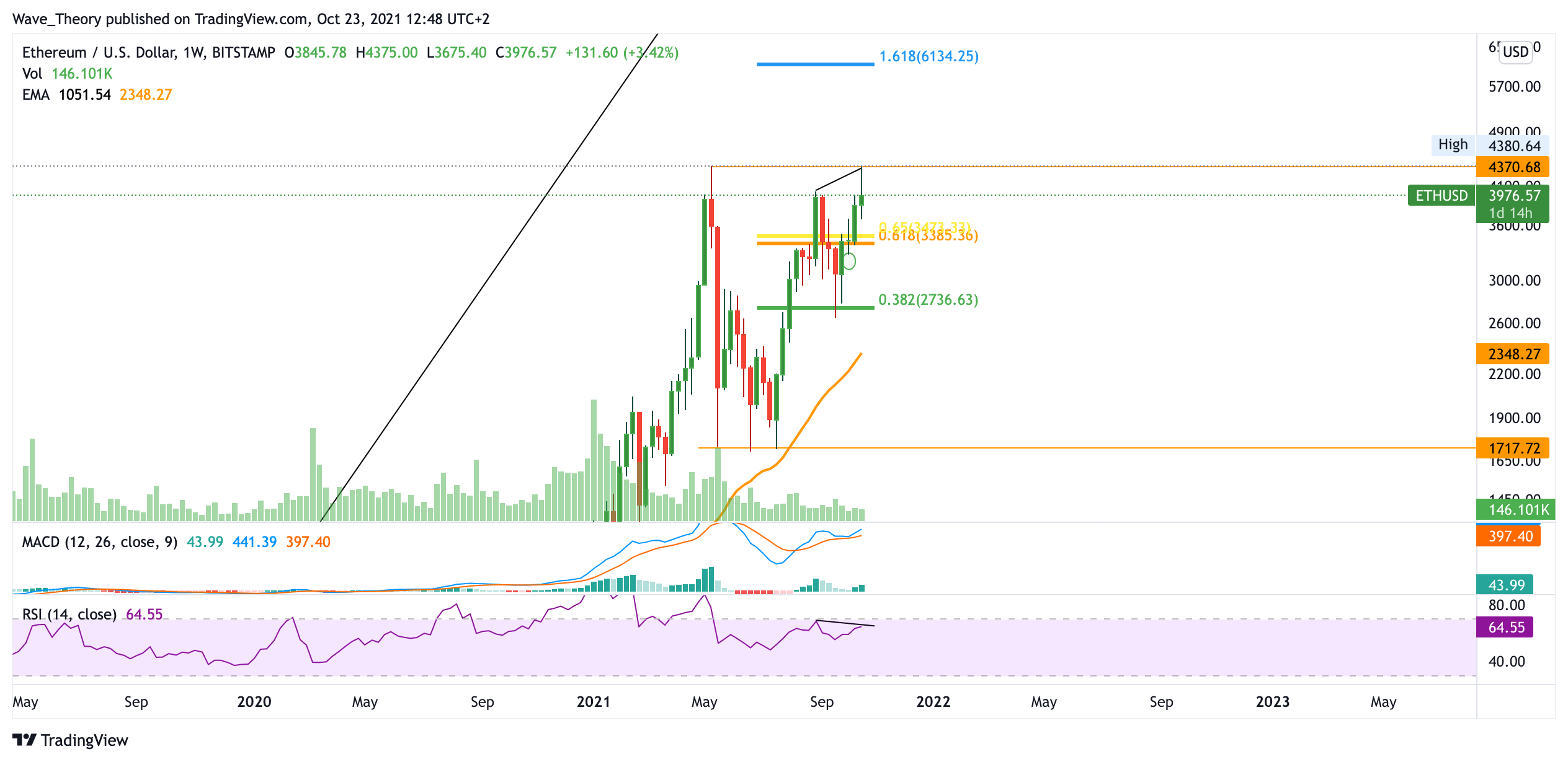 Auch im Wochenkurs droht aktuell eine bärische Divergenz im RSI. Sollte der Ethereum Kurs die nächsten 48 Stunden noch tiefer fallen und zum neuen Wochenstart tiefer liegen als zum Start dieser Woche, liegt eine Fortsetzung der Abwärtsbewegung nahe. Sollte es dem ETH Kurs jedoch gelingen, den Widerstand bei rund 4.400 USD zu brechen, so könnte er auf rund 6.000 USD steigen.