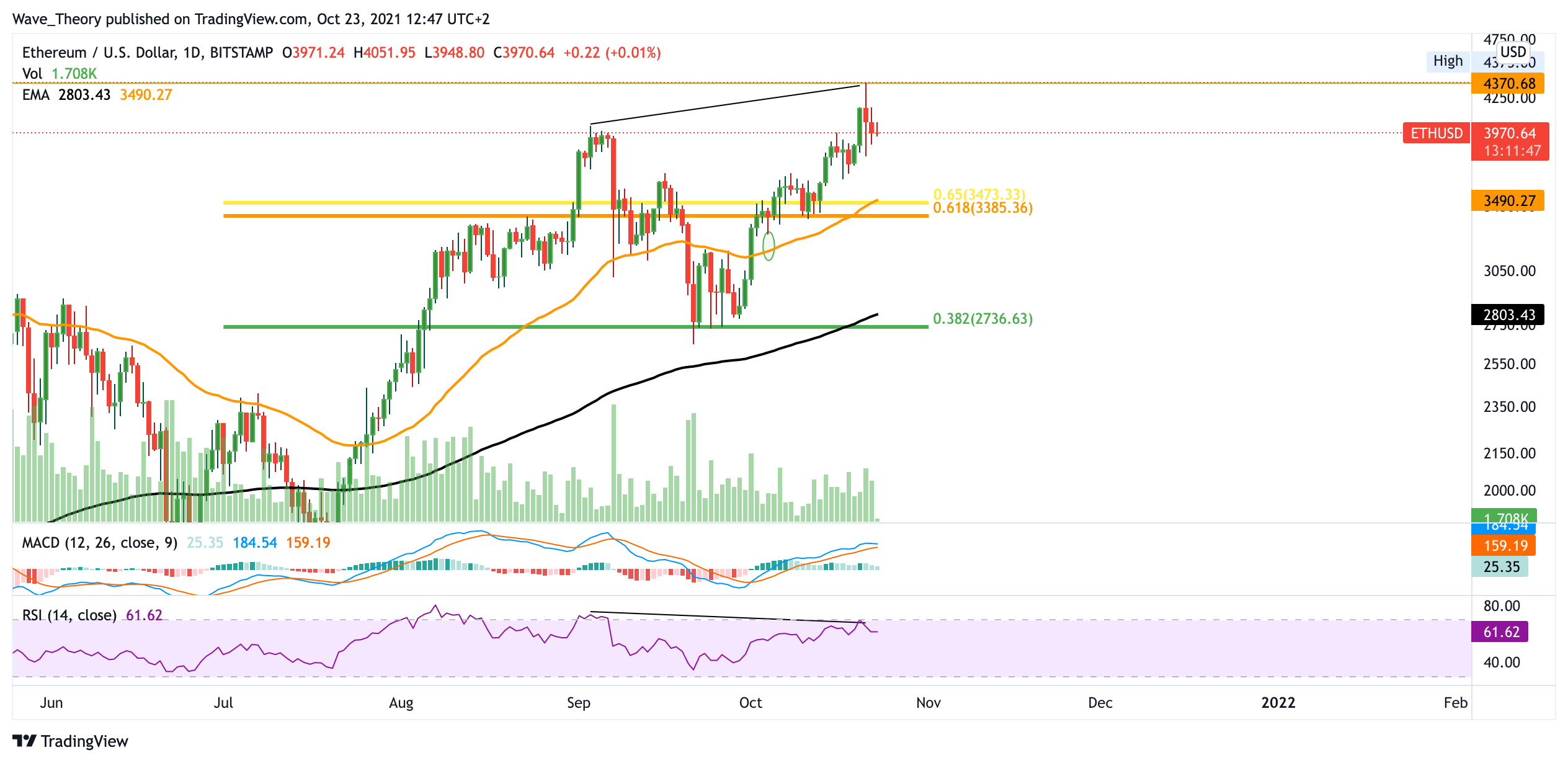 Der Ethereum Kurs erreichte fast exakt das Allzeithoch bei 4.380 USD und fiel daraufhin rund 10 %. Während der Ethereum Kurs fort einen Hochpunkt formte, bildete sich eine massive bärische Divergenz im RSI ab. Auf die bärische Abweisung am Widerstand des Allzeithochs bei rund 4.400 USD könnte eine stärkere Abwärtsbewegung folgen. Unterstützung findet der ETH Kurs dabei zwischen 3.300 – 3500 USD, wo der 50-Tage-EMA die wichtige Golden Ratio Unterstützung kreuzt. Eine Etage tiefer findet Ethereum dann bei 2.700 USD signifikante Unterstützung. Dort kreuzt der 200-Tage-EMA das wichtige 0,382 Fibonacci Niveau.