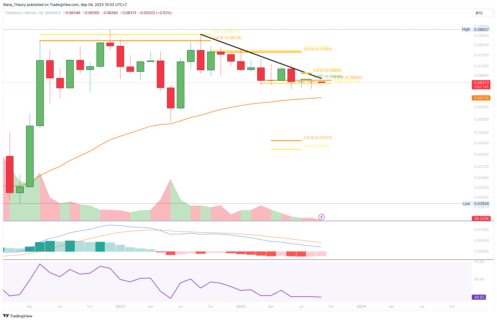 Gegen Bitcoin befindet sich der Ethereum Kurs seit sieben Monaten an der Golden Ratio Unterstützung bei rund 0,063 BTC. Wenn sie nicht erfolgreich hält, könnte der Kurs zum 50-Monate-EMA bei rund 0,057 BTC korrigieren. Das impliziert ein Abwärtspotenzial von rund 9 %.