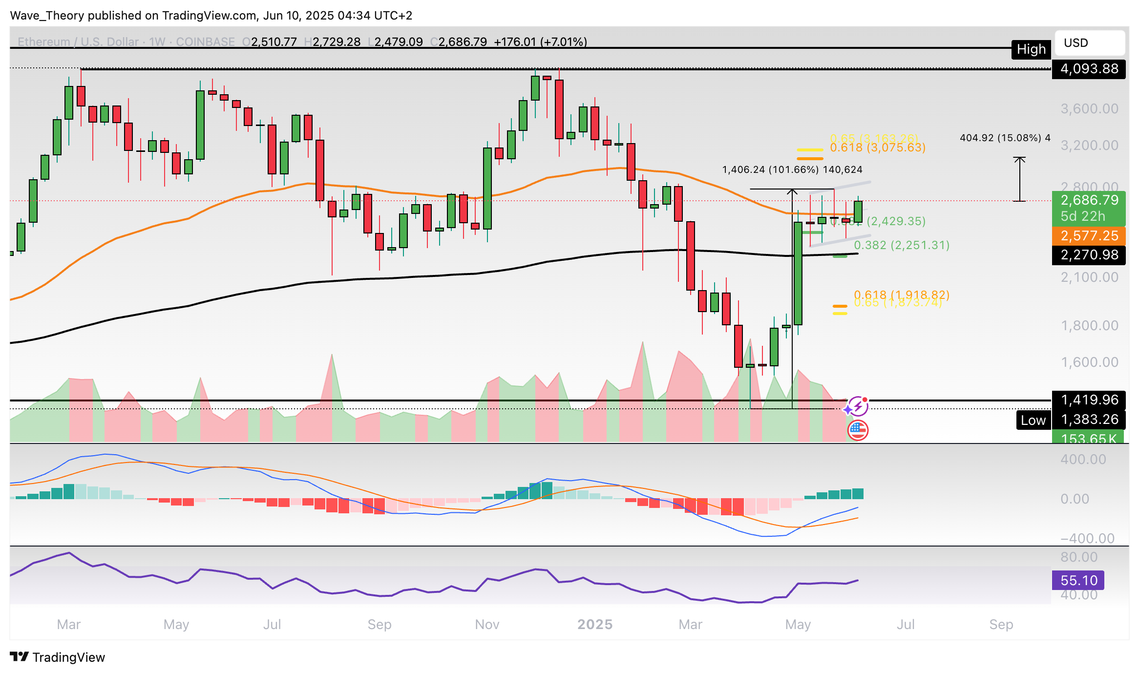 Doch jetzt scheint Ethereum den 50-Wochen-EMA Widerstand zu überwinden. Damit könnte er um weitere 15 % steigen, um den Golden Ratio Widerstand bei rund 3.100 USD zu erreichen.