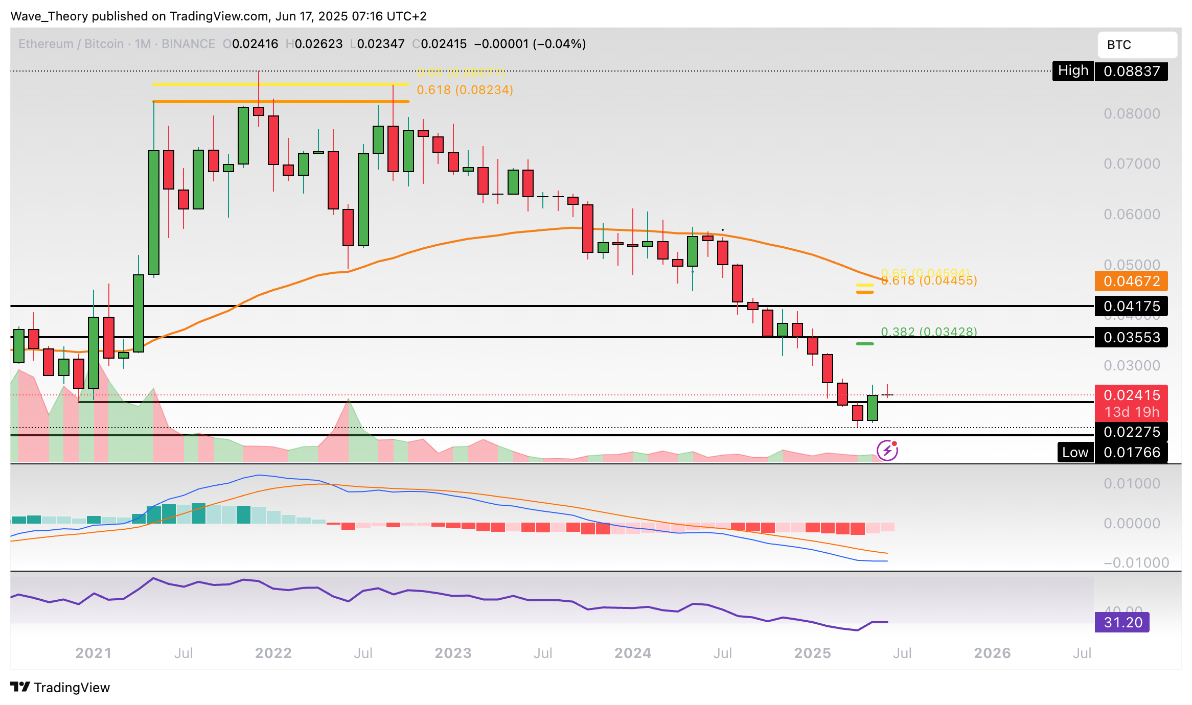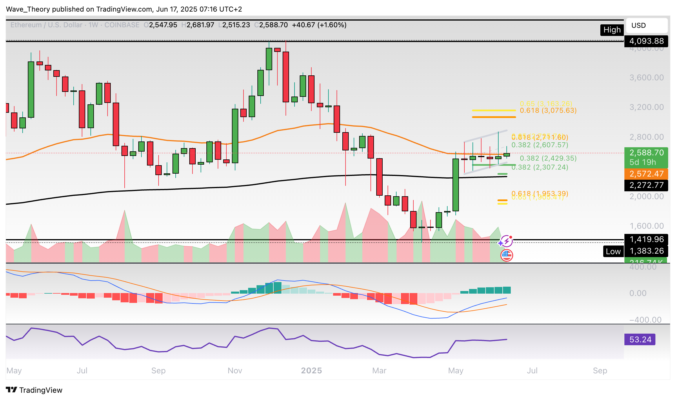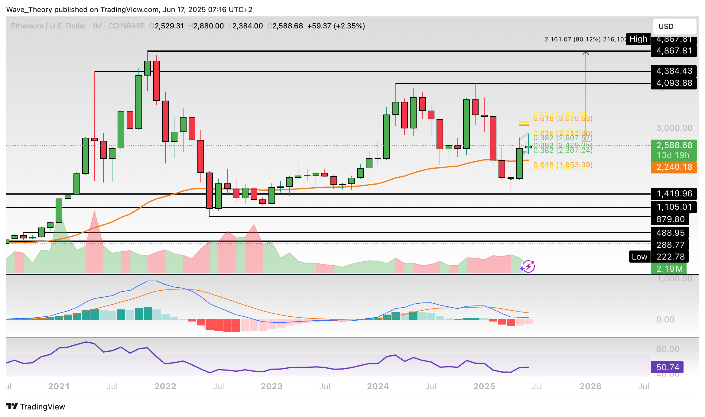 Sollte Ethereum die nächsten Fib Widerstände brechen, könnte der Kurs um weitere 80 % steigen, um das ATH bei rund 4.900 USD zu erreichen.