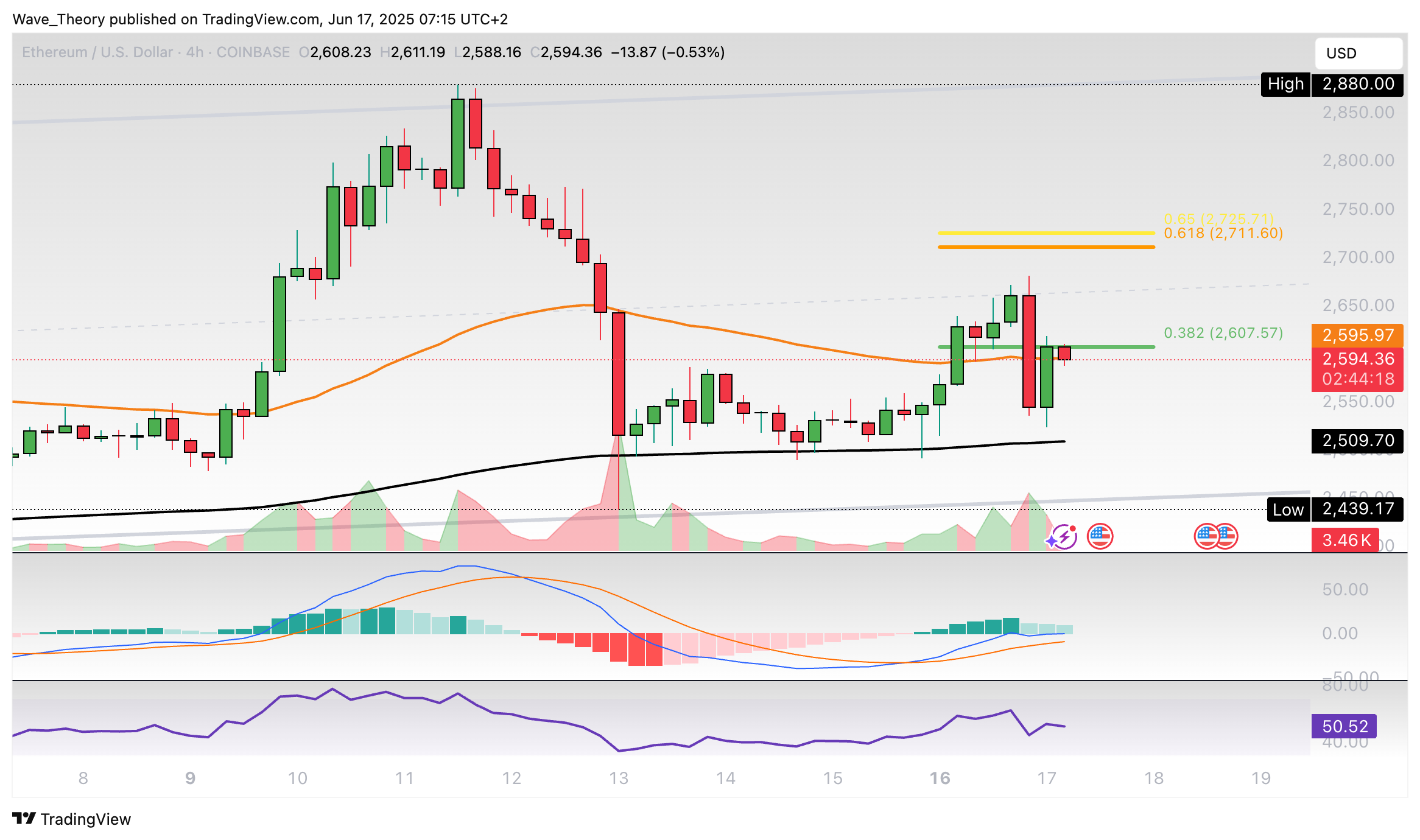 Im 4H-Chart sieht es etwas bärischer aus. Ethereum könnte jetzt am 0,382 Fib Widerstand bei rund 2.608 USD bärisch abgewiesen werden.