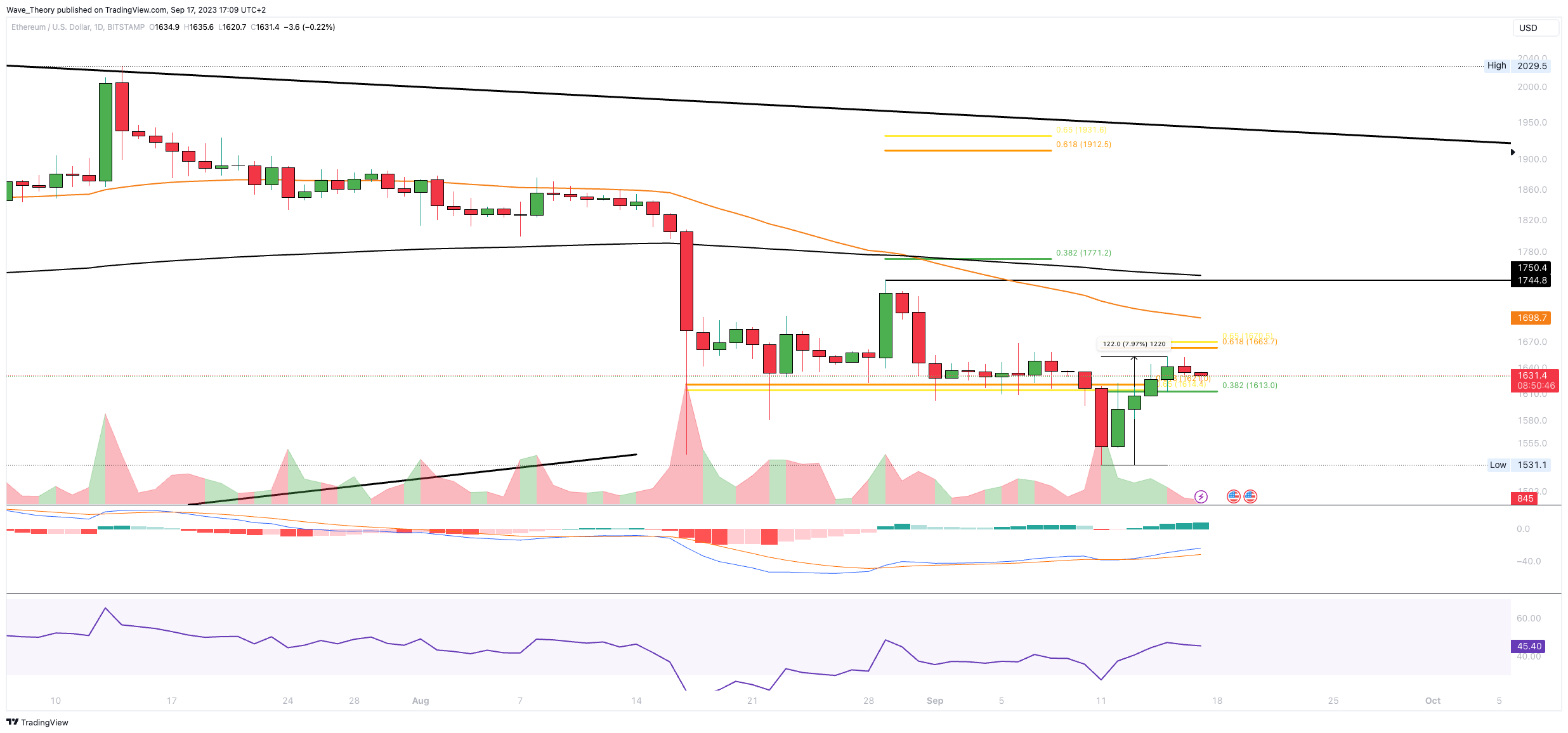 Wenn Ethereum diesen bricht, könnte der Kurs zum 0,382 Fib Niveau am 50-Wochen-EMA bei rund 1.772 USD steigen. Bricht Ethereum auch diesen Widerstand, wartet bei rund 1.931 USD der entscheidende Fib Widerstand. Mit einem Bruch der Golden Ratio bei rund 1.931 USD wäre die Korrektur beendet.