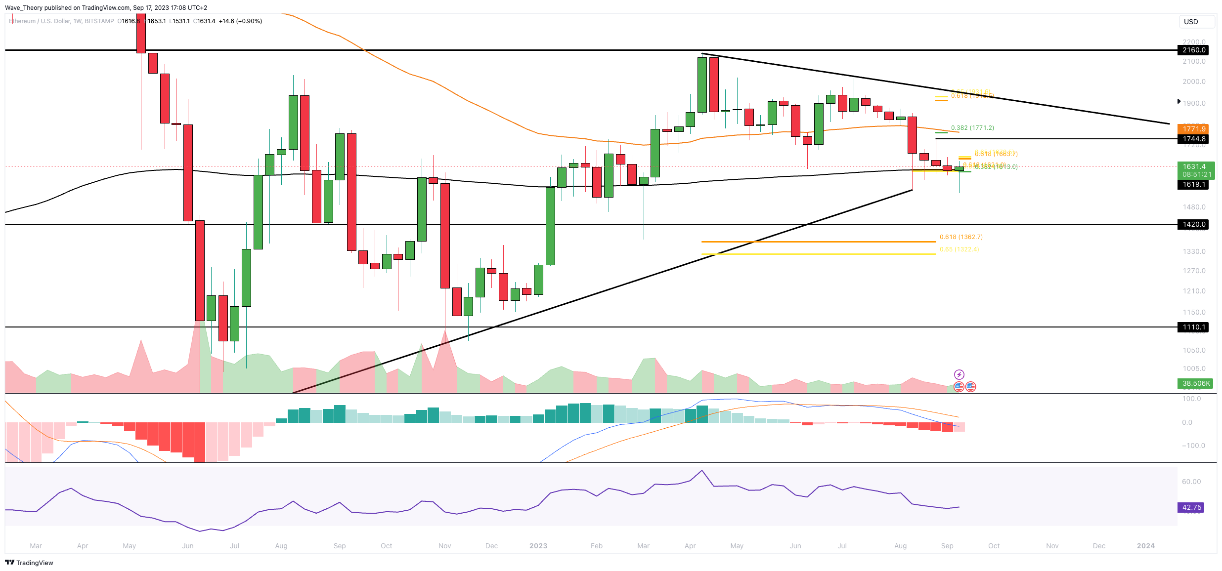 Im Wochenchart kann das Histogramm des MACDs in dieser Woche wieder bullisch höher ticken. Die MACD Linien sind dabei aber noch bärisch überkreuzt und der RSI bewegt sich in neutralem Territorium. Ethereum stößt jetzt bei rund 1.665 USD auf den nächsten signifikanten Fib Widerstand.