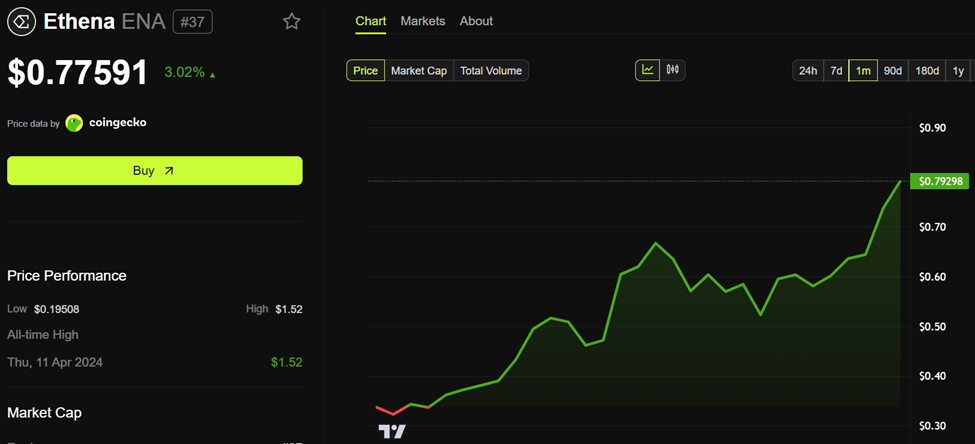 Zum Zeitpunkt dieses Schreibens wurde Ethena für 0,7759 USD gehandelt, was einem Anstieg von über 3 Prozent in den letzten 24 Stunden entspricht.