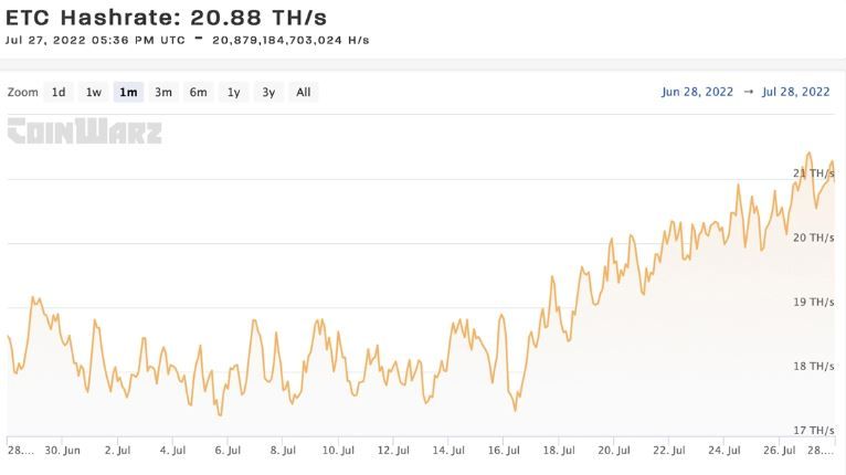 Eine höhere Hashrate beim PoW-Mechanismus wird als Zeichen der Popularität und Sicherheit der Blockchain gesehen. Es wird vermutet, dass die Ethereum Miner angesichts des Merge, nun auf Classic wechseln. Da die Mining Hardware sonst für nichts anderes zu gebrauchen ist, stellt dies die einzig logische Erklärung dar.