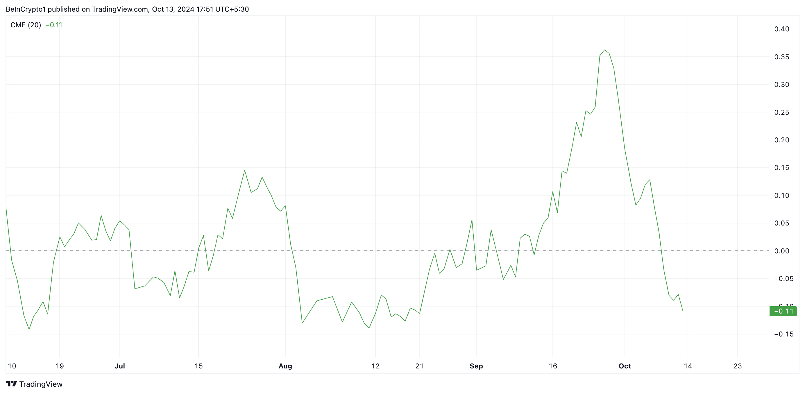 Ein negativer CMF zeigt, dass das Asset mehr Verkäufe als Käufe erlebt hat. Es signalisiert, dass mehr Händler verkaufen als ansammeln.