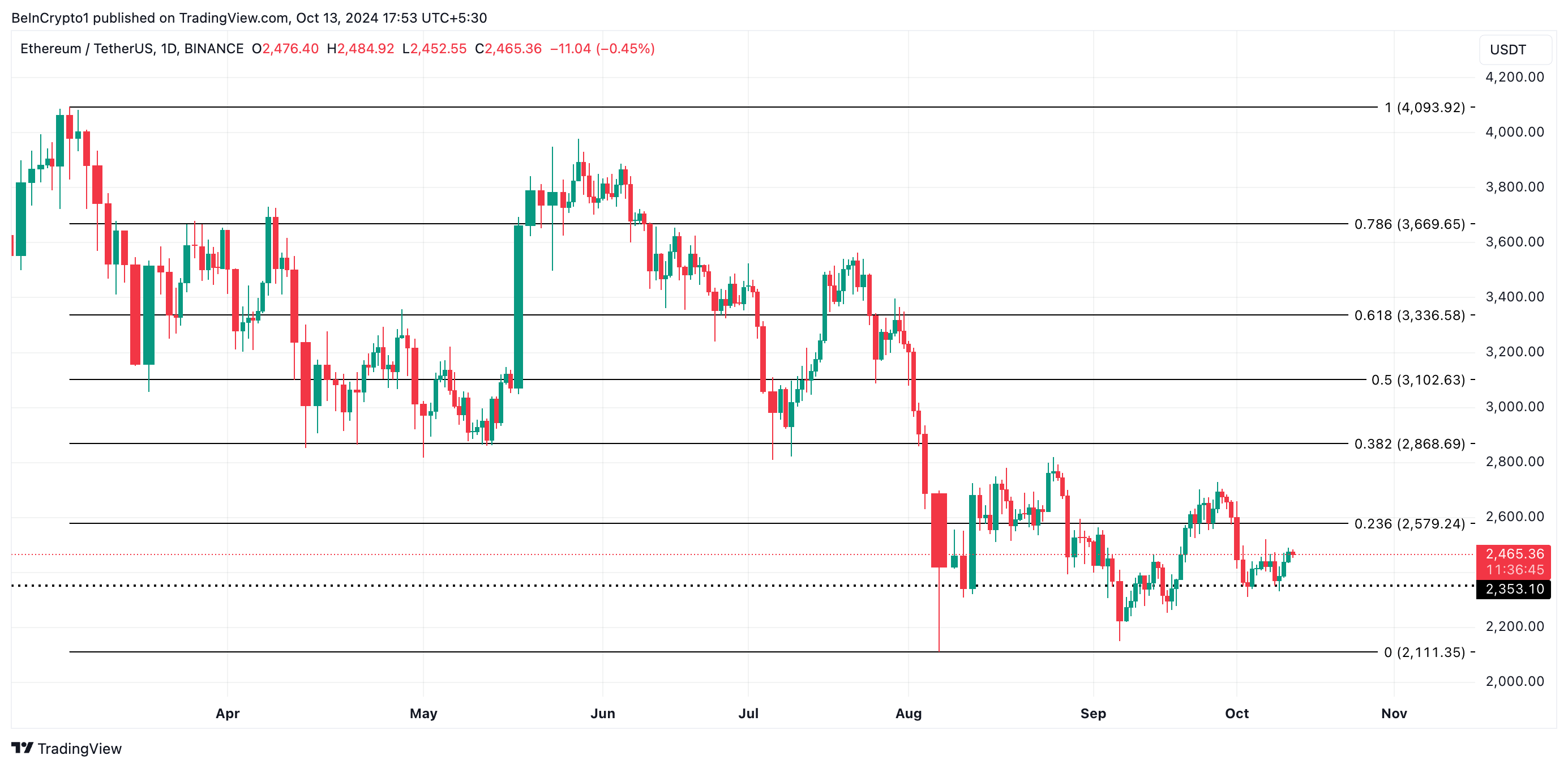 ETH wird derzeit zu 2.465 USD gehandelt. Der ETH-Kurs könnte auf sein unmittelbares Unterstützungsniveau von 2.353 USD fallen, wenn die Verkaufsaktivität zunimmt. Sollten die Bullen dieses Preisniveau jedoch nicht verteidigen, wird der Wert von ETH weiter auf 2.111 USD fallen.