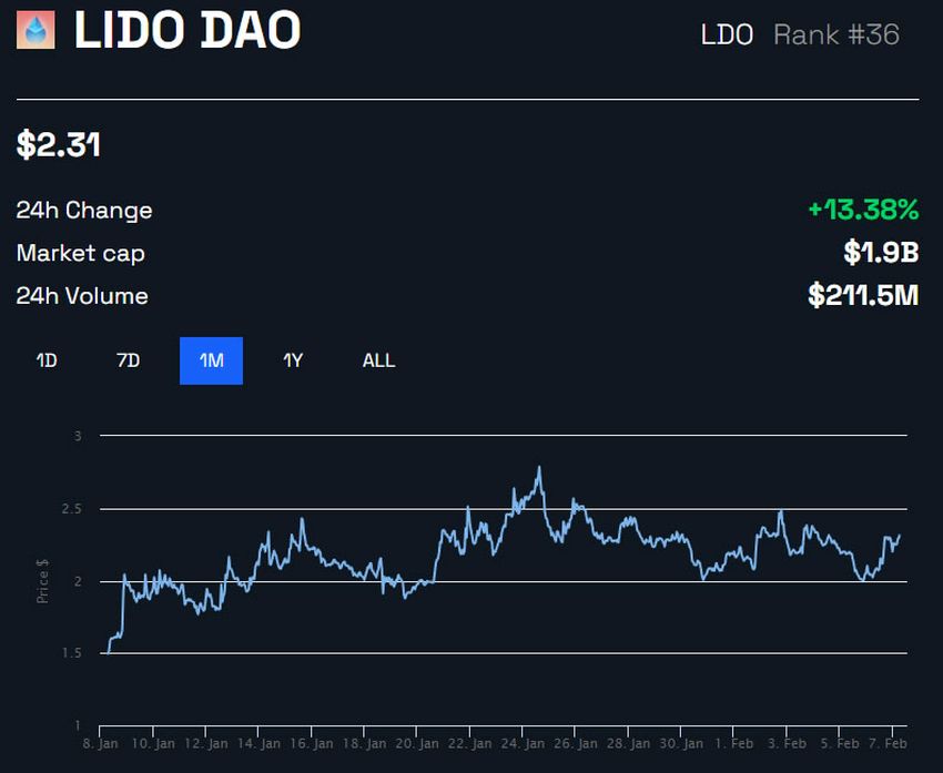 Der Kurs von LDO, dem nativen Token der Plattform, verzeichnet zum Zeitpunkt der Veröffentlichung (07. Februar 2023) bei 2,34 US-Dollar ein Tagesplus von 14 %. Darüber hinaus stieg der Preis des Tokens im letzten Monat um 58 % an. Allerdings befindet sich der LDO Kurs aktuell immer noch 68,3 % unter dem Allzeithoch (7,30 US-Dollar) vom August 2021.