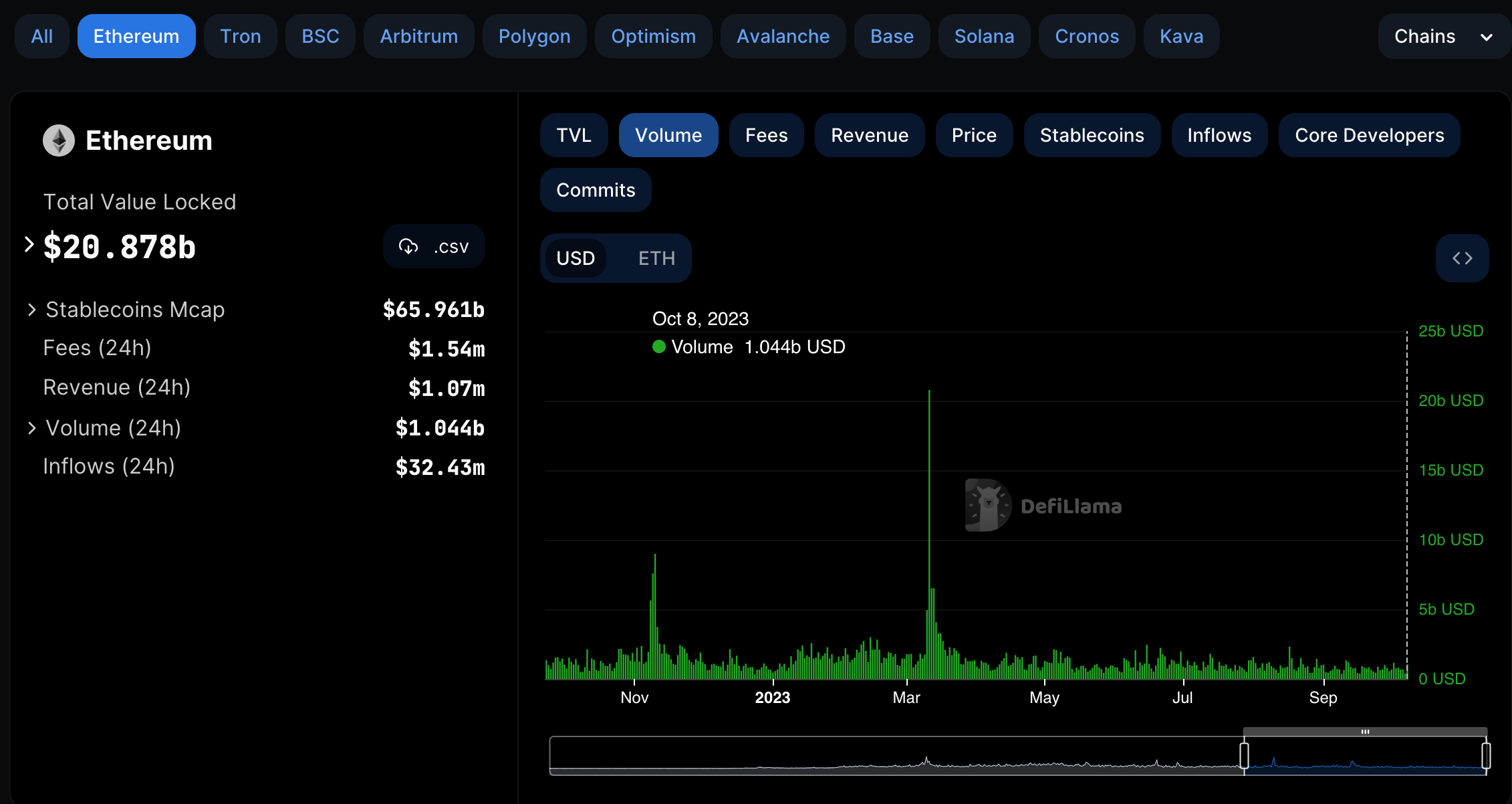 Die rückläufigen Transaktionszahlen wiederum scheinen auf ein schwindendes Interesse an NFT-Handel und DeFi-Aktivitäten zurückzugehen. Wie On-Chain-Daten von DeFiLlama zeigen, ist das Handelsvolumen in diesem Sektor seit April extrem niedrig.