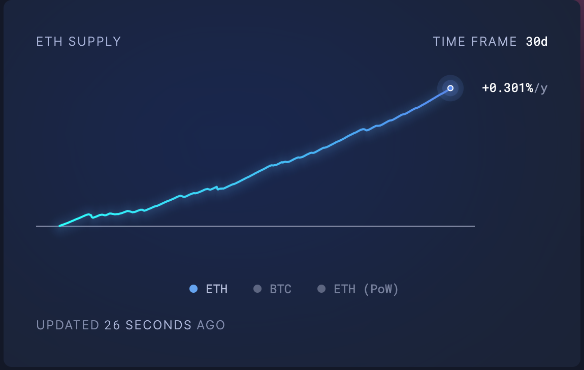 In den vergangenen 30 Tagen stieg das zirkulierende Angebot um ganze 30.000 ETH, wodurch die jährliche Wachstumsrate bis auf 0,301 % anstieg.
