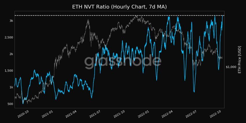 Zu guter Letzt erreichte das ETH-Netzwerkwert-zu-Transaktionen-Verhältnis (NVT-Ratio) vor kurzem ein neues 2-Jahreshoch von 3.154,557. Bei diesem Indikator wird die Marktkapitalisierung von Ethereum durch den gesendeten Gesamtwert des Netzwerks geteilt. Der Wert des Netzwerks und der Nutzwert des Netzwerks gingen in den letzten Monaten im Zuge des Bärenmarkts also stark auseinander. Neue Rekordwerte des Indikators deuten auf eine Fortsetzung dieser Entwicklung hin.